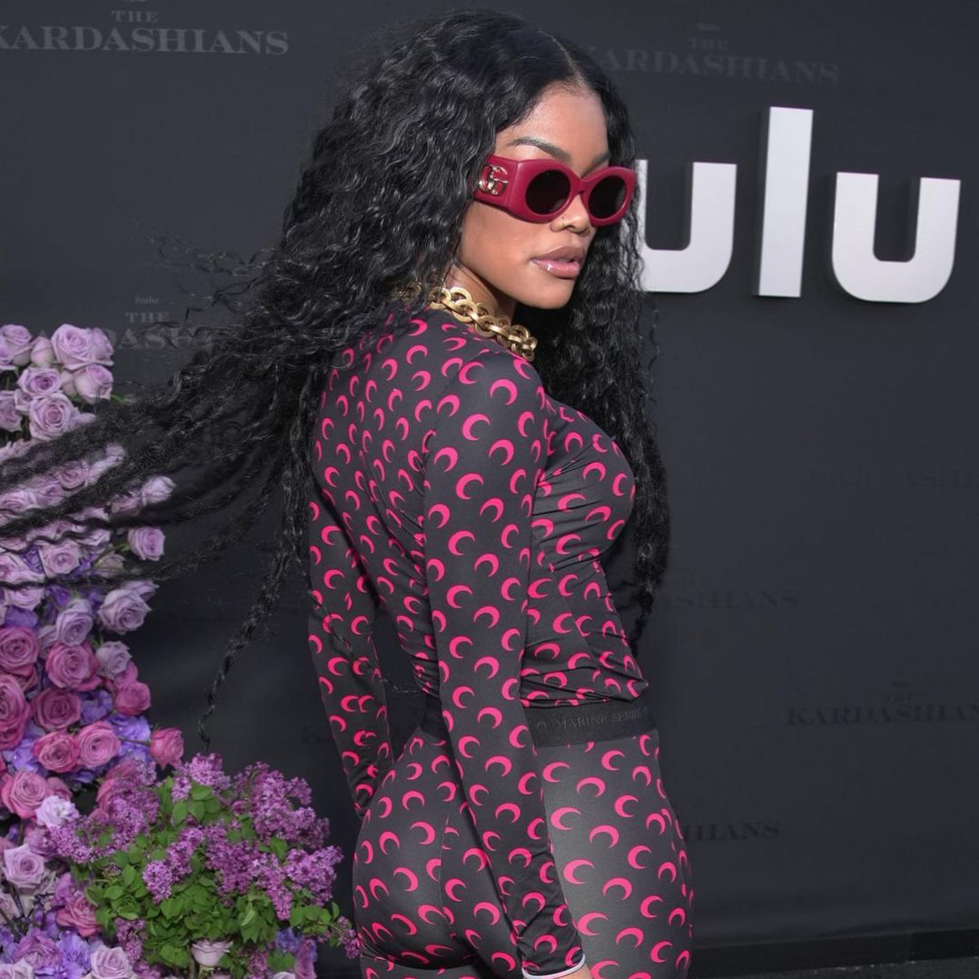 While Beyonce offset the look with patent black accents, Teyana picked up on the red tones in the look with cherry hued boots and Gucci shades.