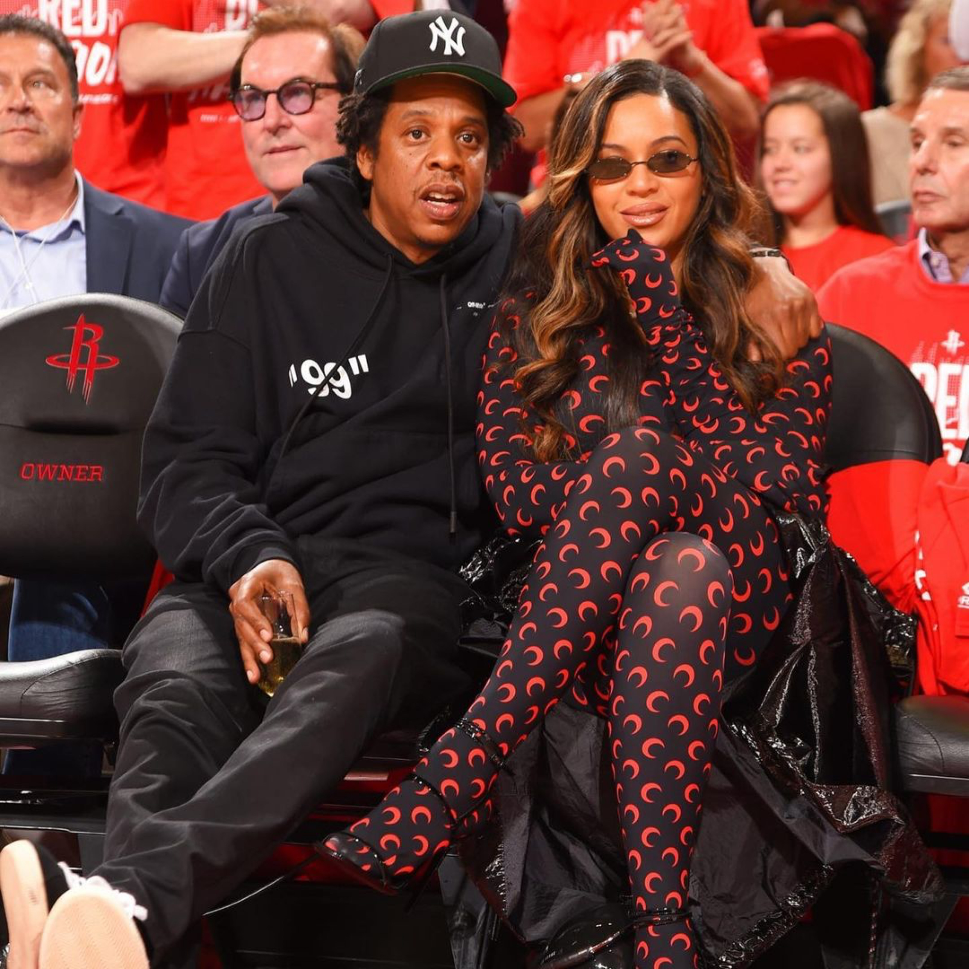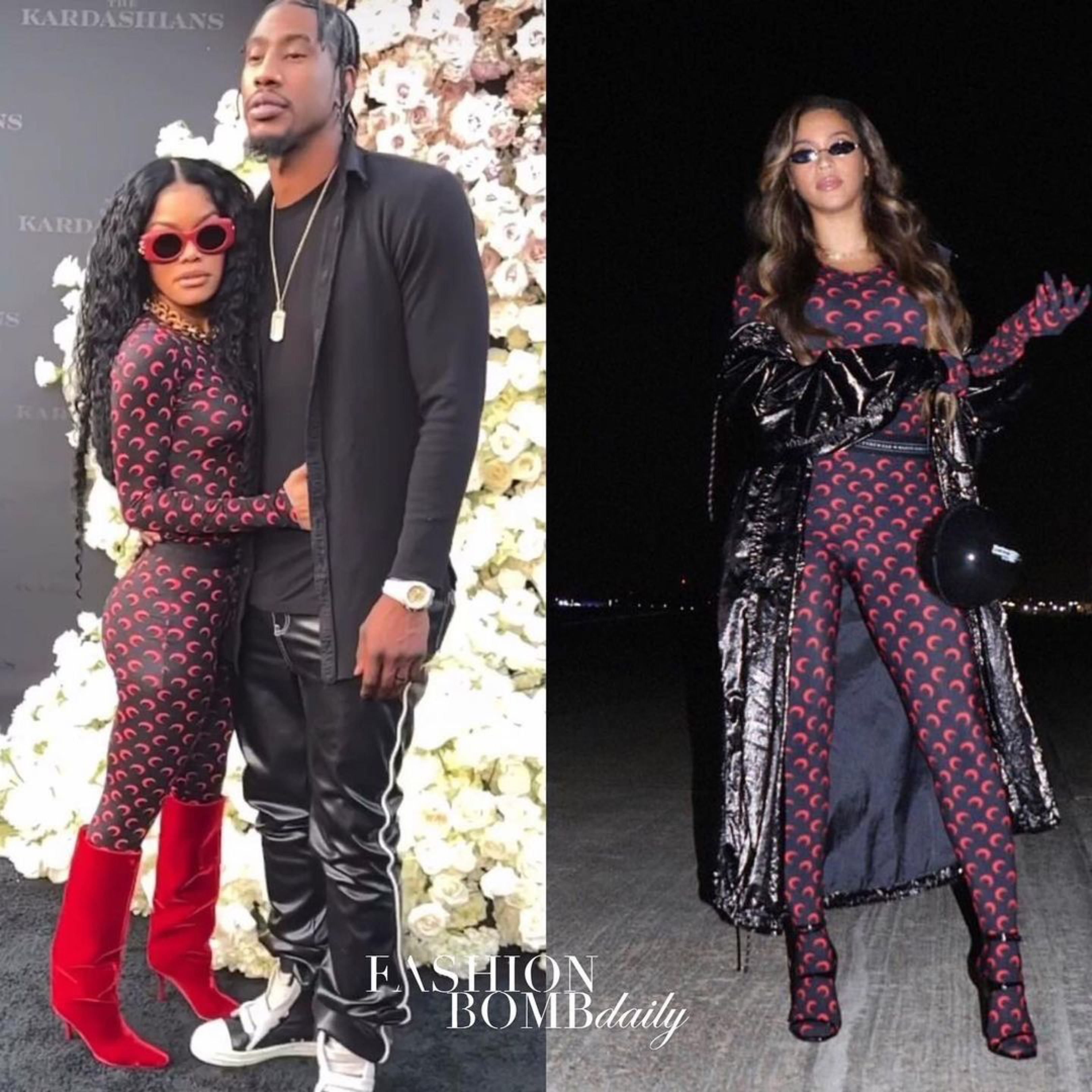 Both Beyoncé, at a basketball game, and Teyana Taylor, at the premiere of The Kardashians in LA, have worn this #MarineSerre set, including a $330 Moon Printed top and $450 pants: