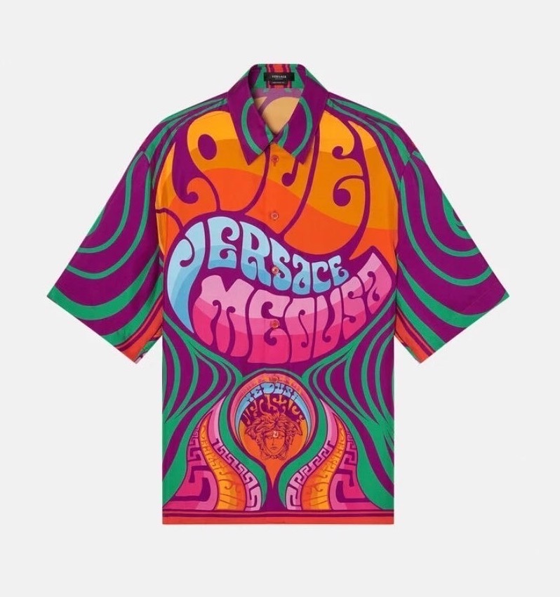 Crafted from pure silk, this shirt boasts the Medusa Music print reminiscent of the carefree spirit of the 1970s. The design features a classic collar and short sleeves.