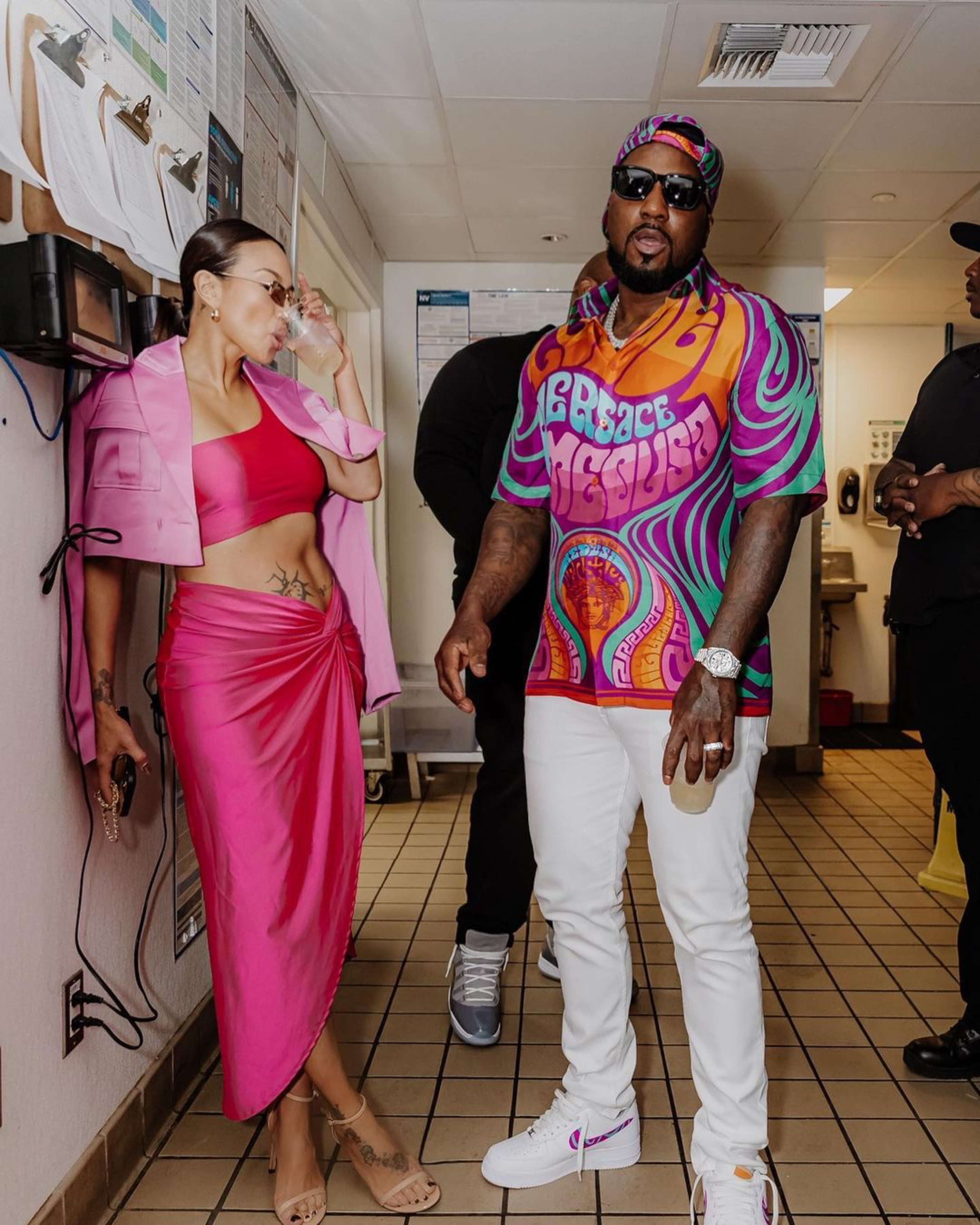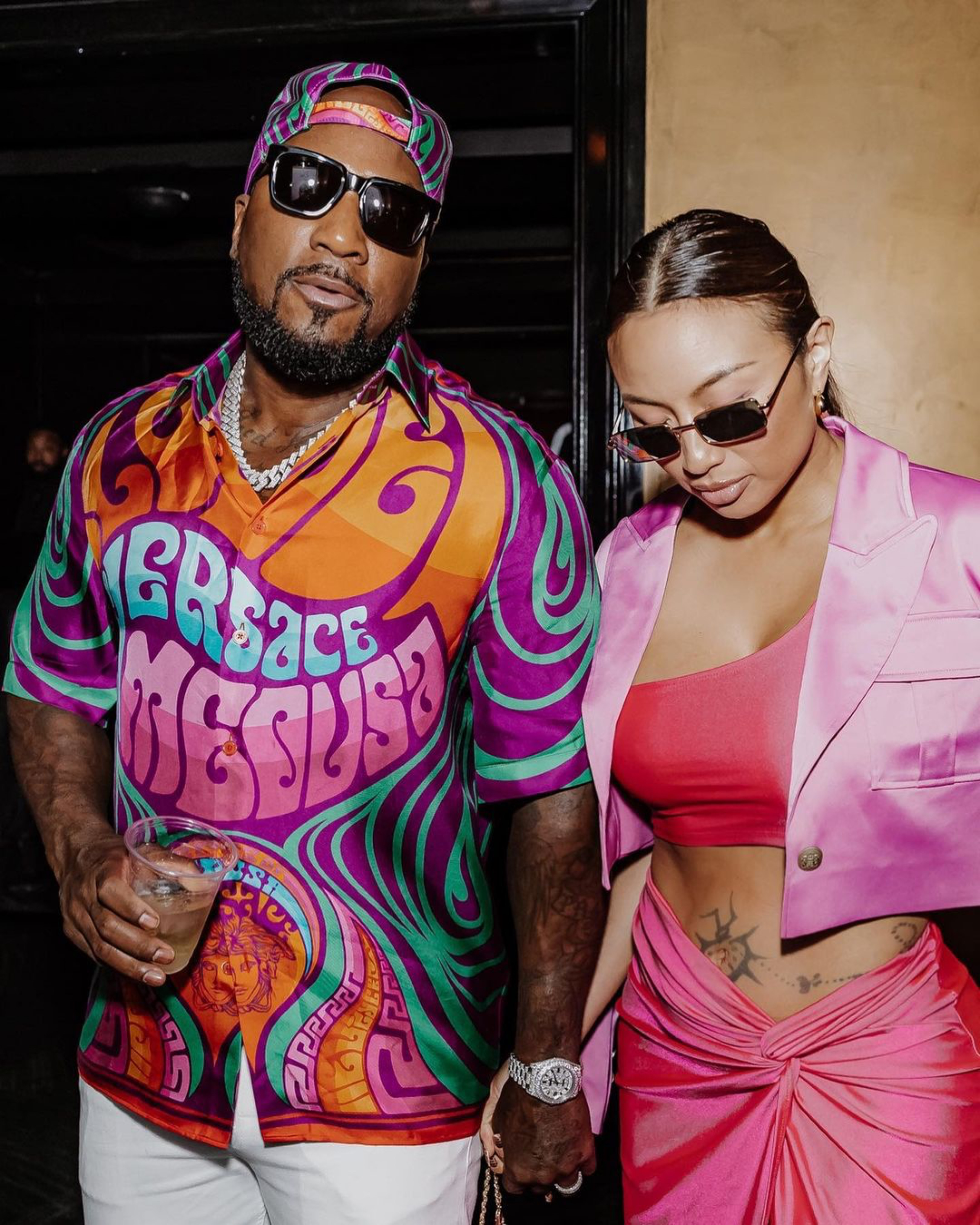 Jeezy and Jeannie Mai headed to a concert in Vegas , with Jeannie Mai wearing a look from her collection with Macys , and Jeezy wearing a $525 Versace logo baseball cap and a $1,150 Versace shirt, styled by @officialkrisshelby .
