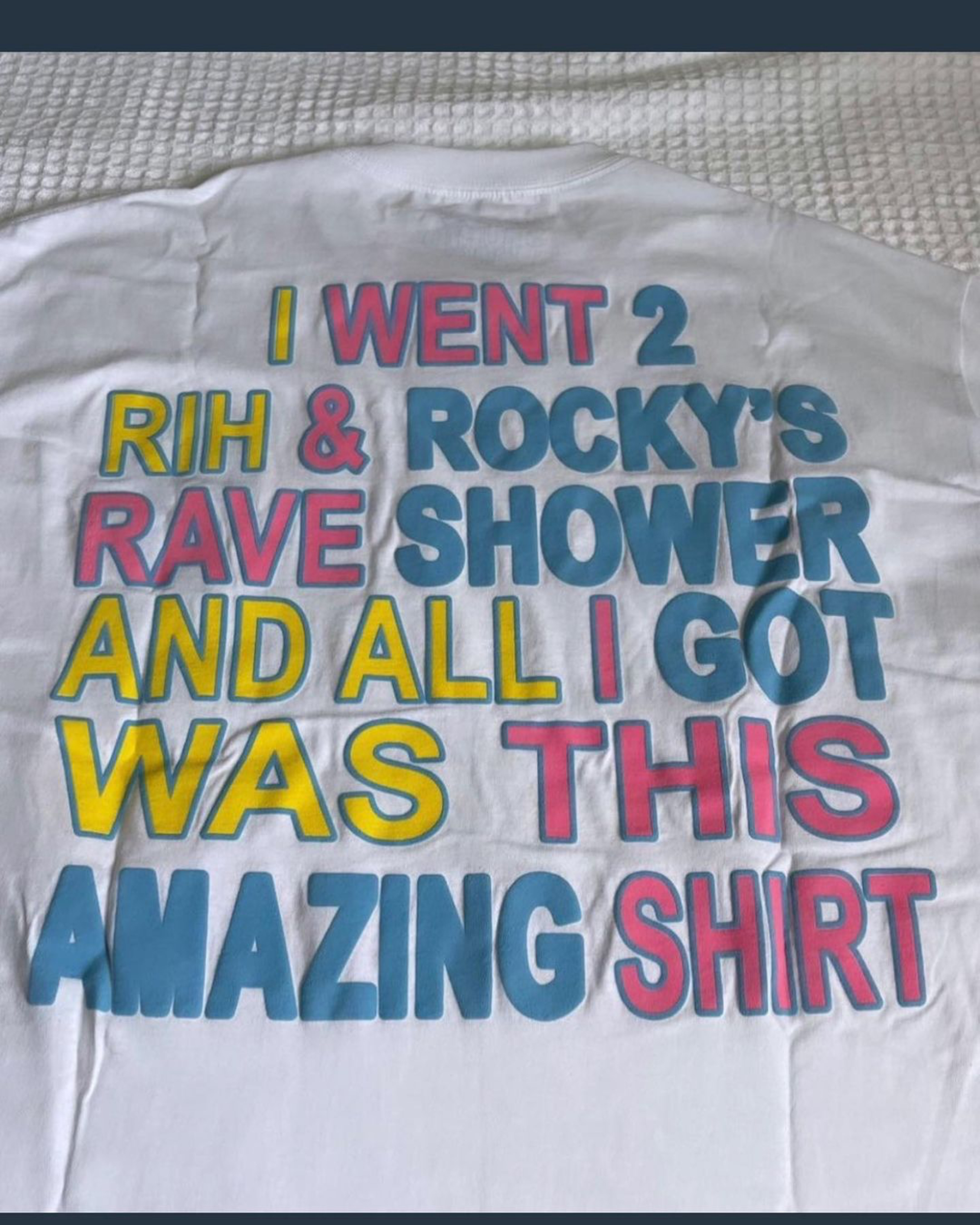The back reads, “I went 2 Rihana’s & Rocky’s Rave Shower and All I got was this Amazing Shirt.”