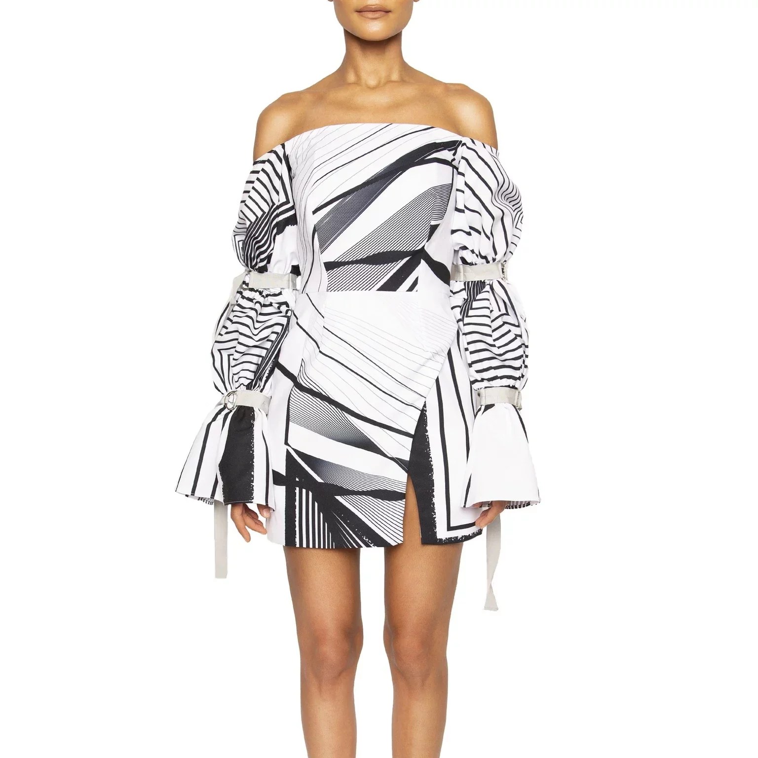 Get the look: $580 Israella Kobla ASHA | Off-Shoulder Mini Dress in Black and White Print