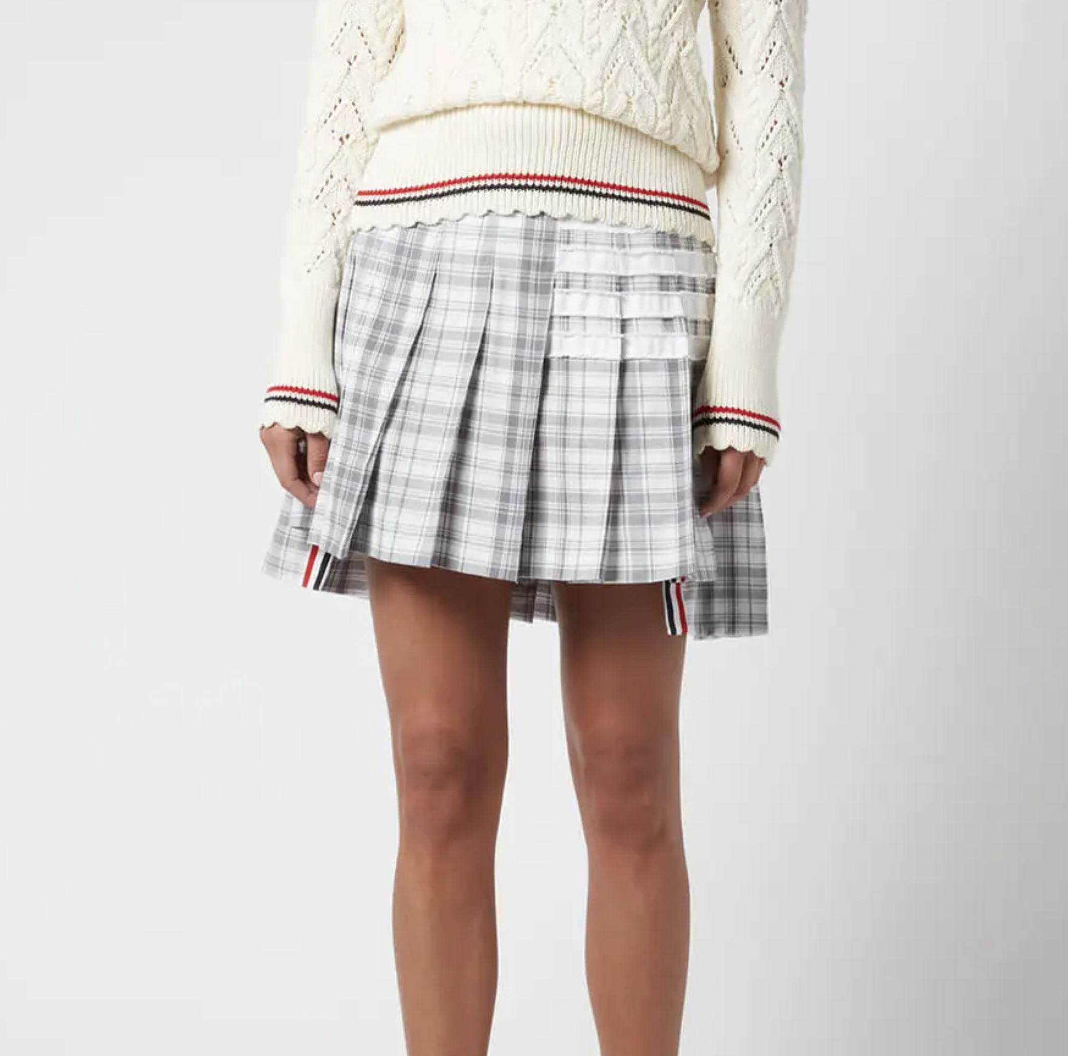 In keeping with the designer’s avant-garde aesthetic, Thom Browne’s checked skirt arrives in a mini, pleated silhouette with a deconstructed hem. It flaunts the label’s signature ‘uniform’ stripes with frayed edges for a nuanced take on a classic design.