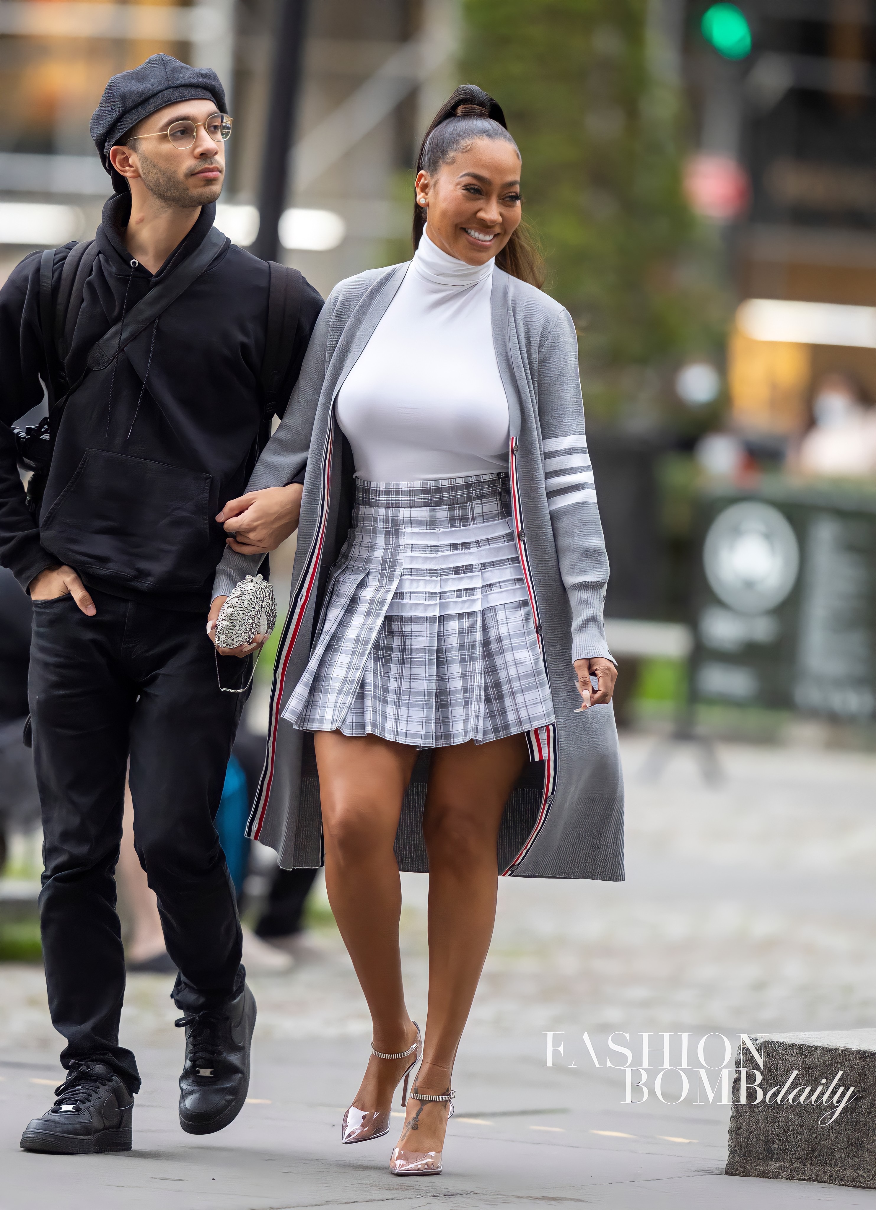 Lala Headed to the Thom Browne show with longtime photographer Tomas Herold wearing a full Thom Browne look, including a $1,450 long T-Bar V Neck Long Cardigan and. $1,387 pleated skirt.