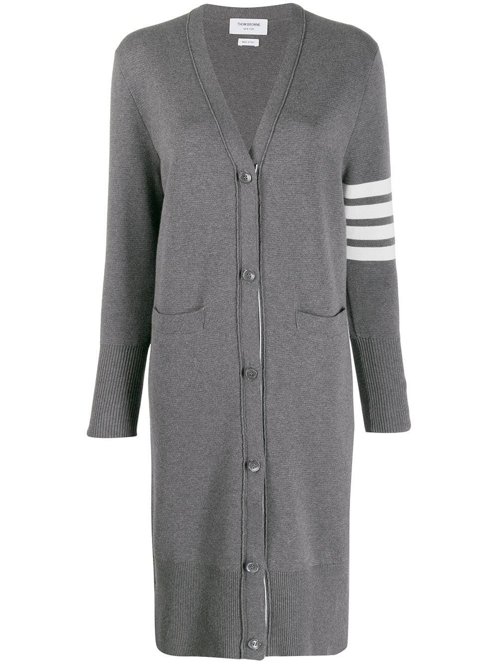 Featuring a v-neck, a front button fastening, two front pockets, long sleeves, button cuffs, a side button fastening, a mid-length, a ribbed hem and cuffs, a signature grosgrain loop tab and a 4-Bar stripe.