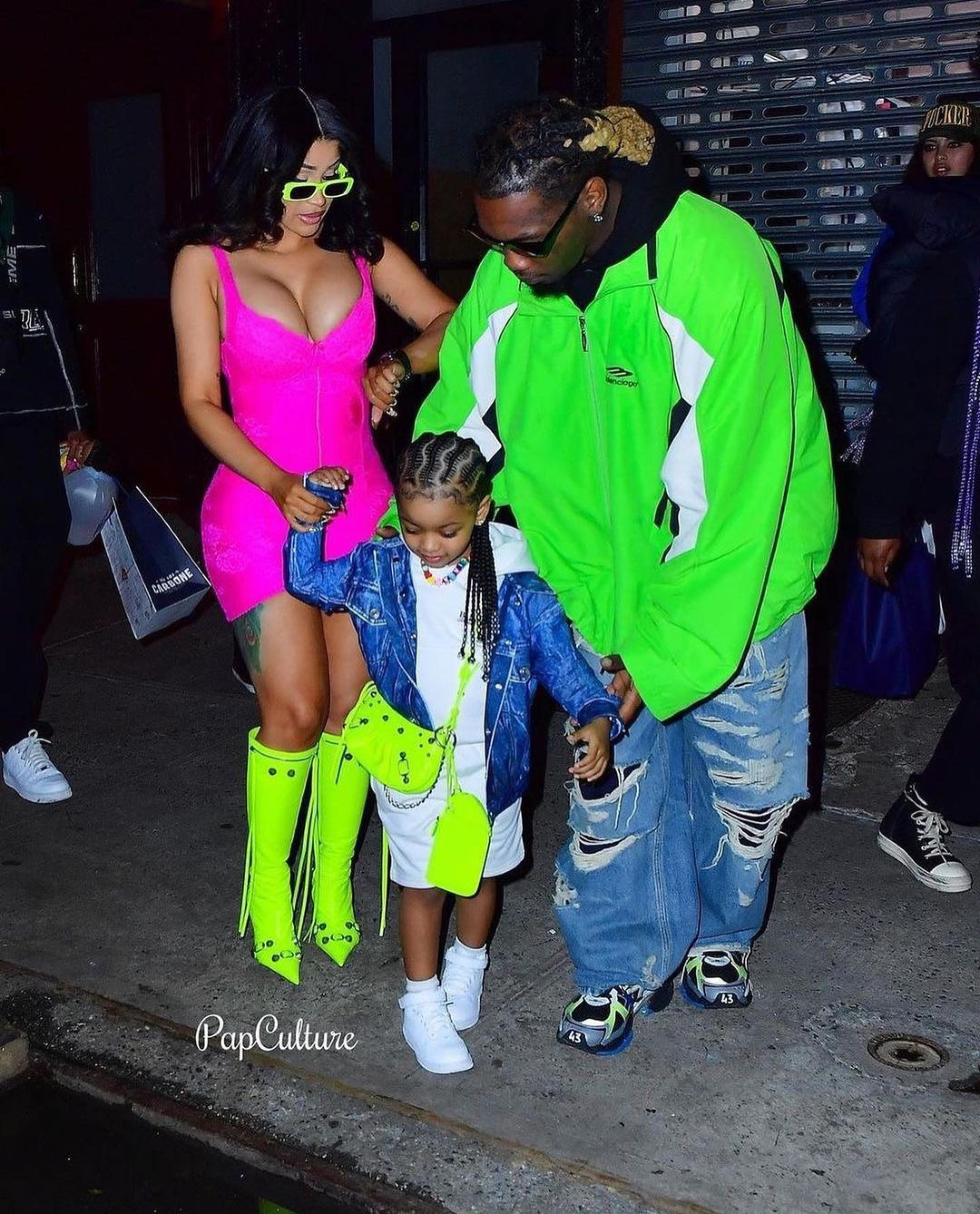 Offset and Kulture also wore Balenciaga looks ($2,390 track suit jacket and $1,690 jeans; $725 necklace and $1,350 bag), styled by @shexshe .