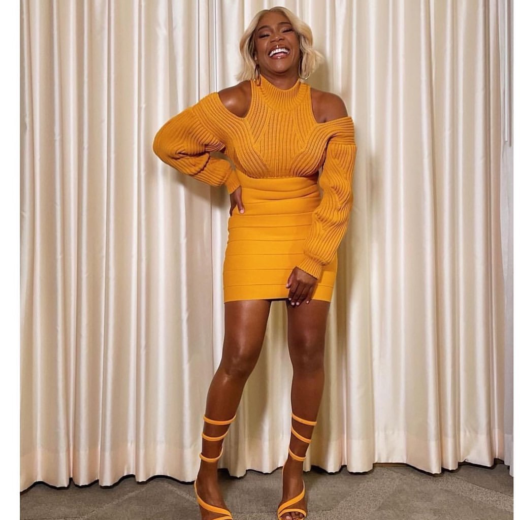 It’s a fashion showdown! Both Tiffany Haddish and Chrishell Stause from Netflix’s Selling Sunset were recently sighted working it in the exact same $1290 Herve Leger Cold-shoulder Ribbed-paneled Bandage Mini Dress. Truth be told, it goes without saying that each of these bombshells radiated in the hot yellow hue cable-knit dress.