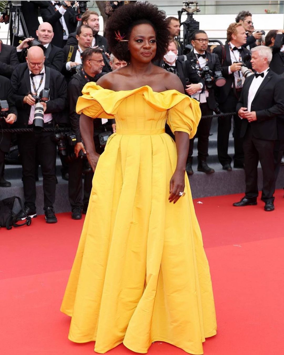 Wearing a Pre-Fall/Winter McQueen design, actress Viola Davis arrived at the premiere of ‘Top Gun: Maverick’ looking regal as can be. The off-shoulder, corset dress in honey yellow was made for her!