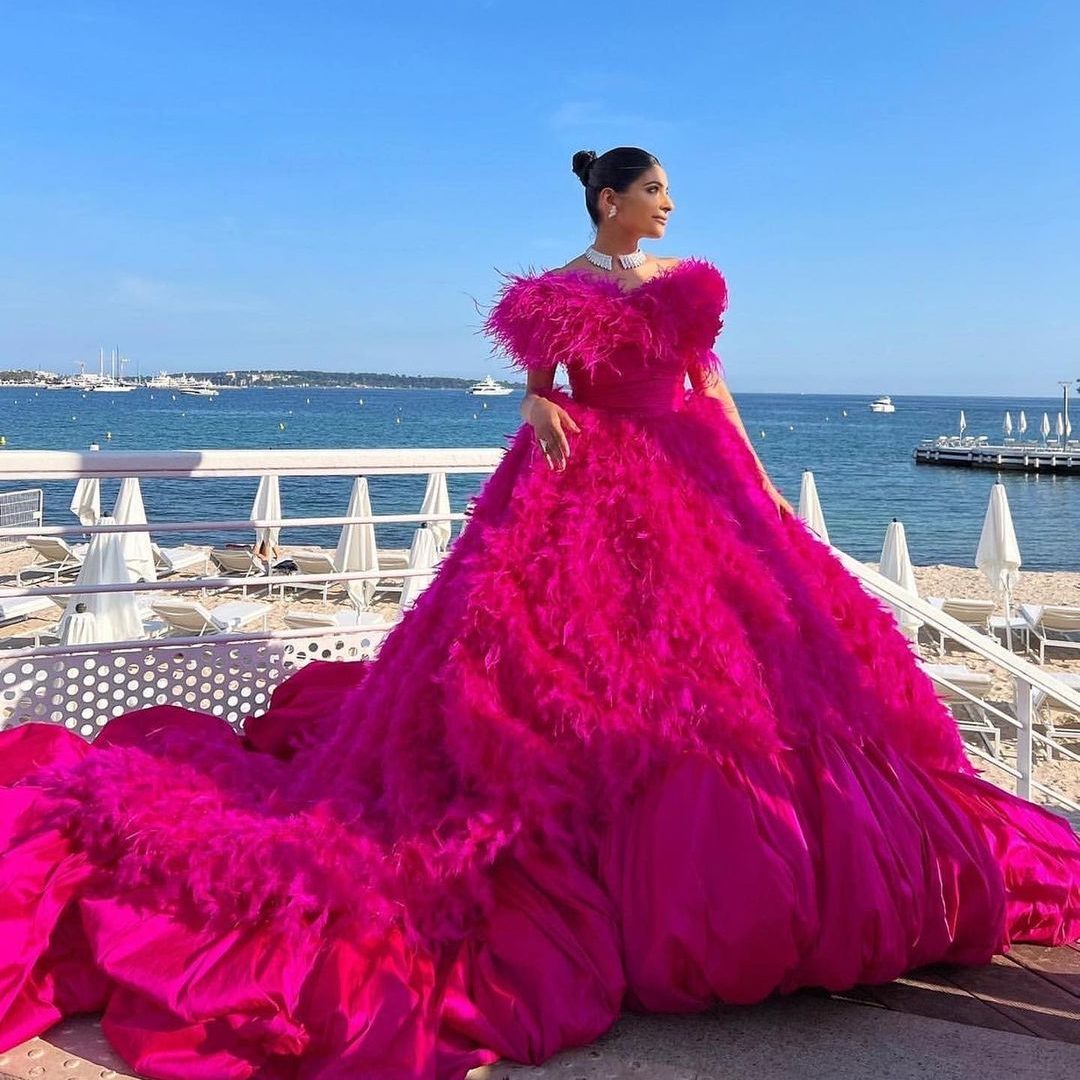 Volume and texture were all the craze on the Cannes red carpet, and influencer Farhana Bodi took it to the next level wearing a fuchsia colored floor-length gown with train and plumage! Her accessories were provided by Renu Oberoi and hair styled by Ahmad Abou El Saad.