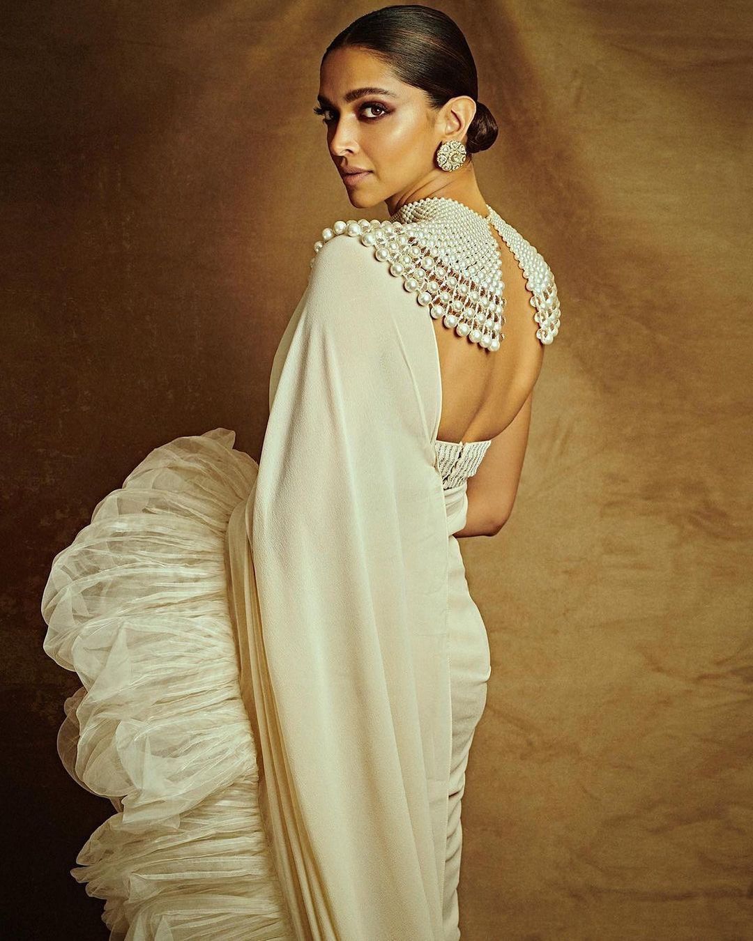 The garment was a traditional saree, often worn by women from South Asia, which consists of fine fabrics draped over one shoulder and wrapped around the waist. For Deepika who was styled by Shaleena Nathani, she wore a strapless, pearl embellished bralette overlapped with a semi-sheer ivory material that featured gathered flounces, creating a ruffled effect.