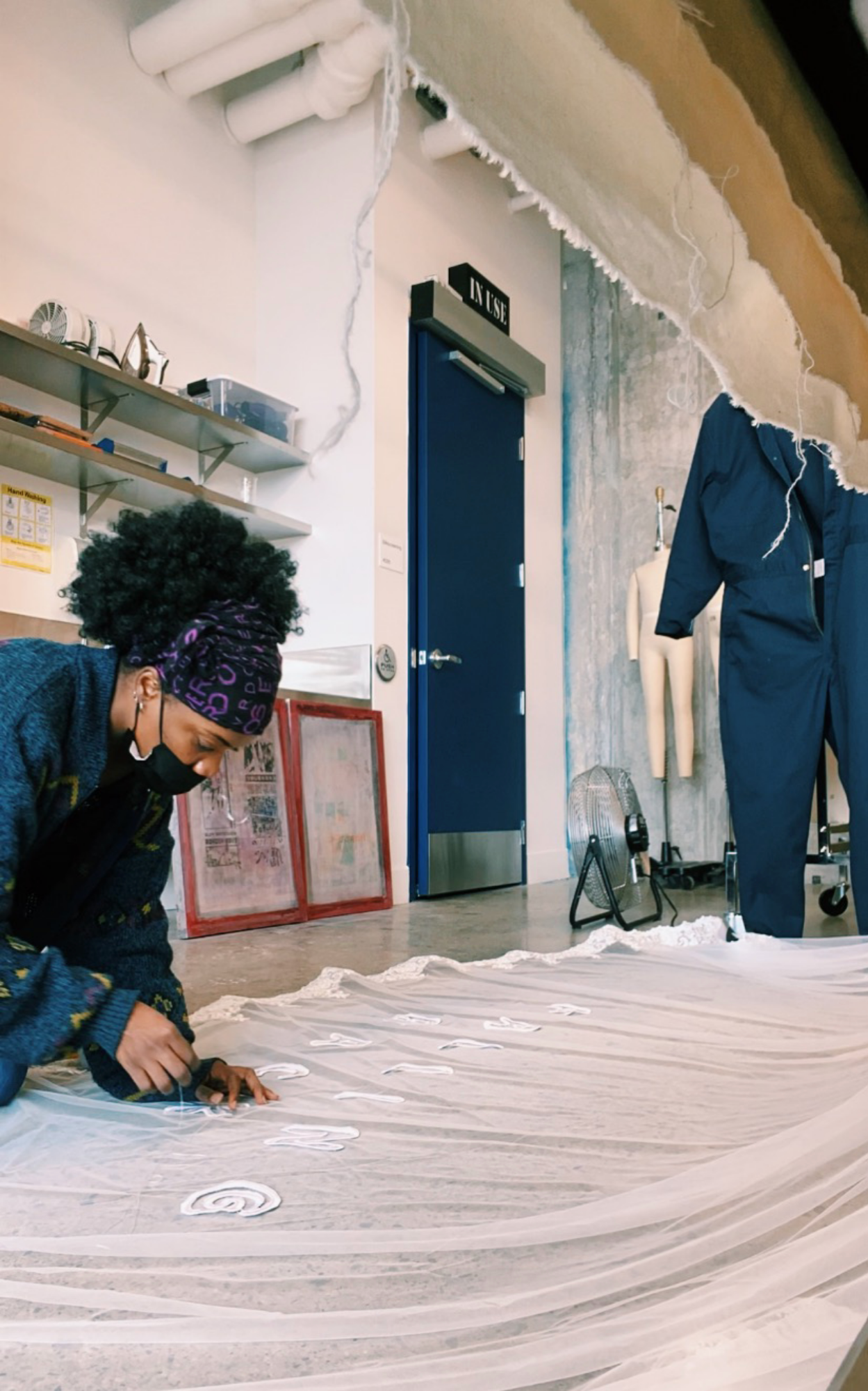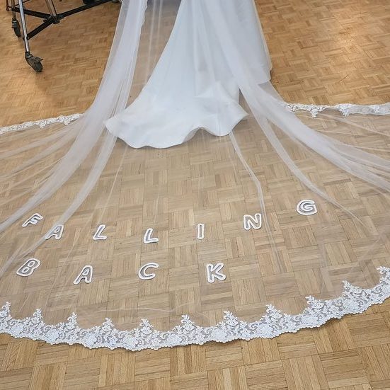 “I have a lot of experience with wedding dresses so this was right up my alley”, she dished to BeautyLifeFun. She explained that the veil was a “collaborative process”, and that key stylist Caitlin Wright, whom she met during her last stint with OVO, came to her with the idea to create a dramatic durag-veil with the song title around the hem. “Lace and tulle are my favorite fabrics to work with, so this sparked a lot of creative juices. After shuffling between material options like pearls, florals, appliqués, etc., to spell out the title ‘Falling Back’, the embroidered letters custom made by LandLord Morrison were finally decided.”