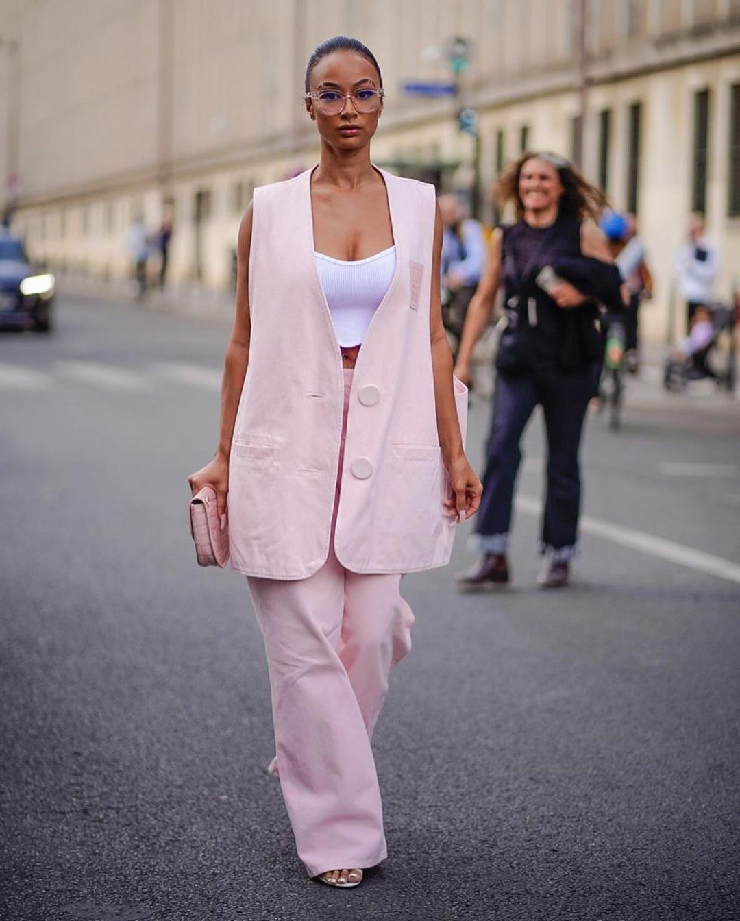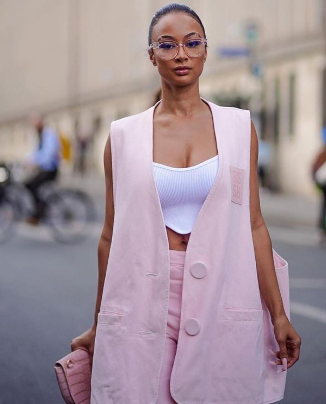 Draya wore a $948 Raf Simons denim oversized logo patch gilet with matching wide-leg jeans in a dusty pink color to the presentation. The evidently menswear inspired look carried a sexy feminine flare – she looked sublime!