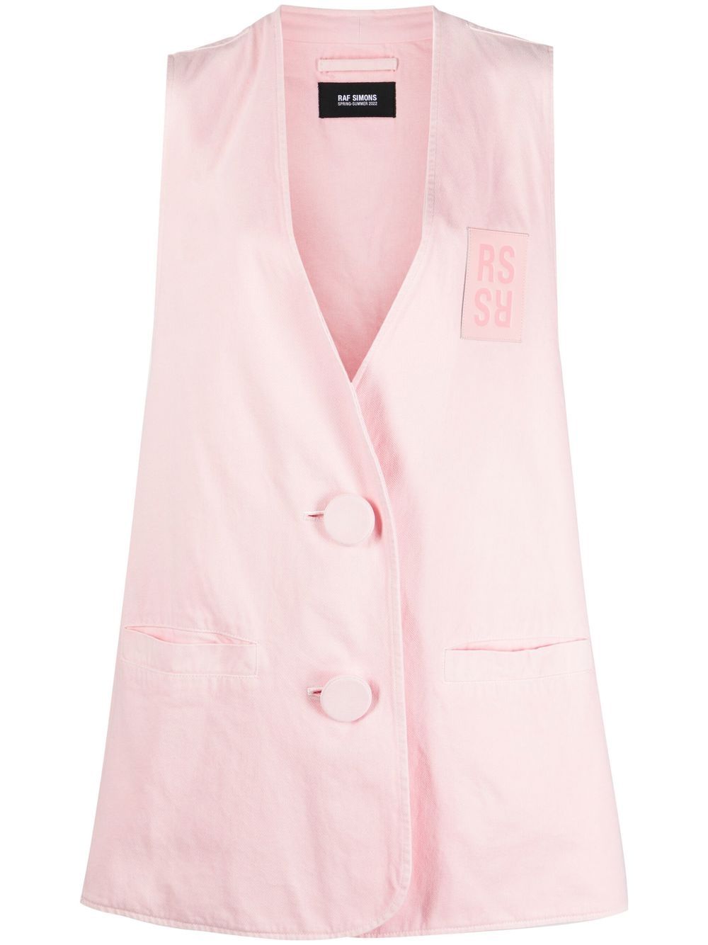 Get the look: $948 Raf Simons Denim Oversized Logo Patch Gilet