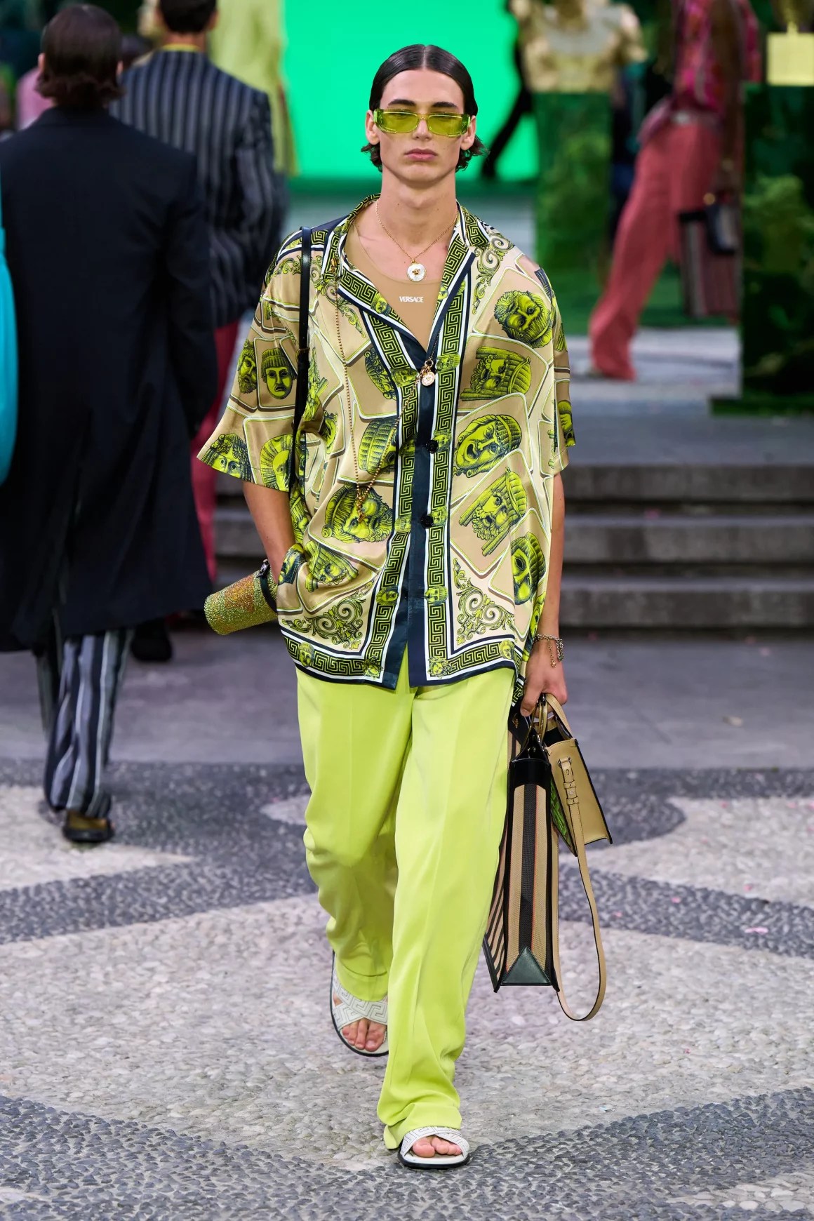 Donatella Versace returned the masks of Pompeii from the archive for this collection, but this time with a twist. Vivid hues of neon green, blue, pink and orange make up the new color ways of the emblematic print. Additionally, the collection was a play on textures, mixing laser cutout latex with delicate knits and snakeskin with stripes!