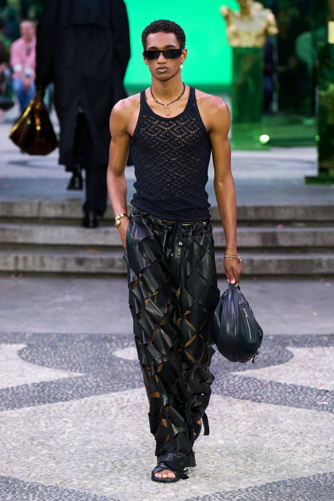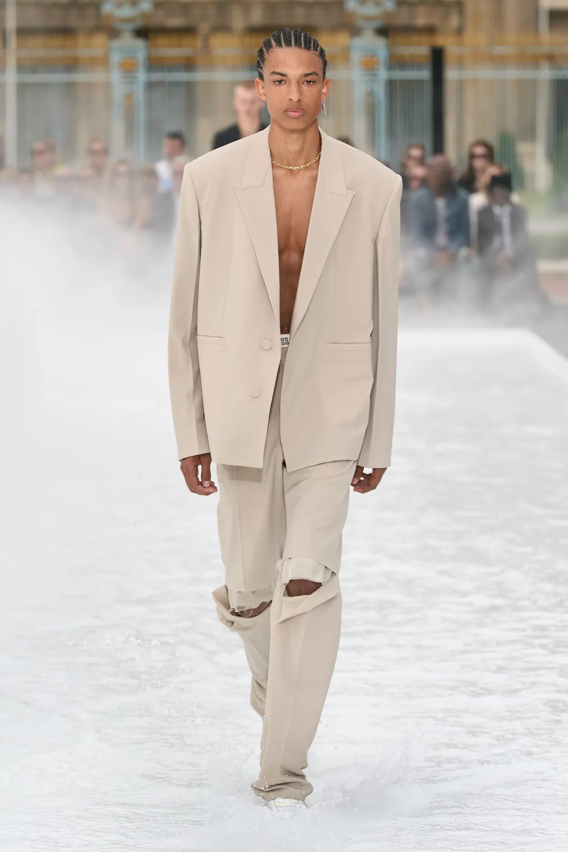 In a strong catwalk presentation, Givenchy added their touch to the menswear style scene. Each garment was a thought-out balance of soft and harsh elements incorporating rips, tears and hardware to otherwise delicate and clean looks, while adding pastels or mesh to those in need of a lighter air.
