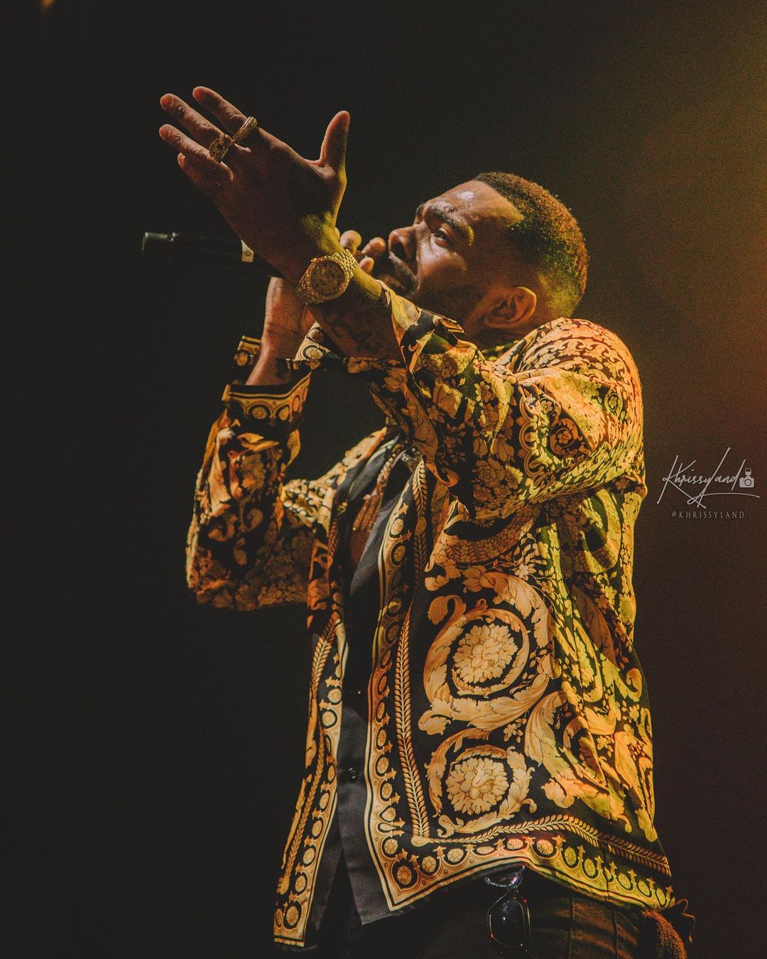 After a quick change, he then serenaded the crowd wearing a $1,825 Versace Barocco Silk Shirt.