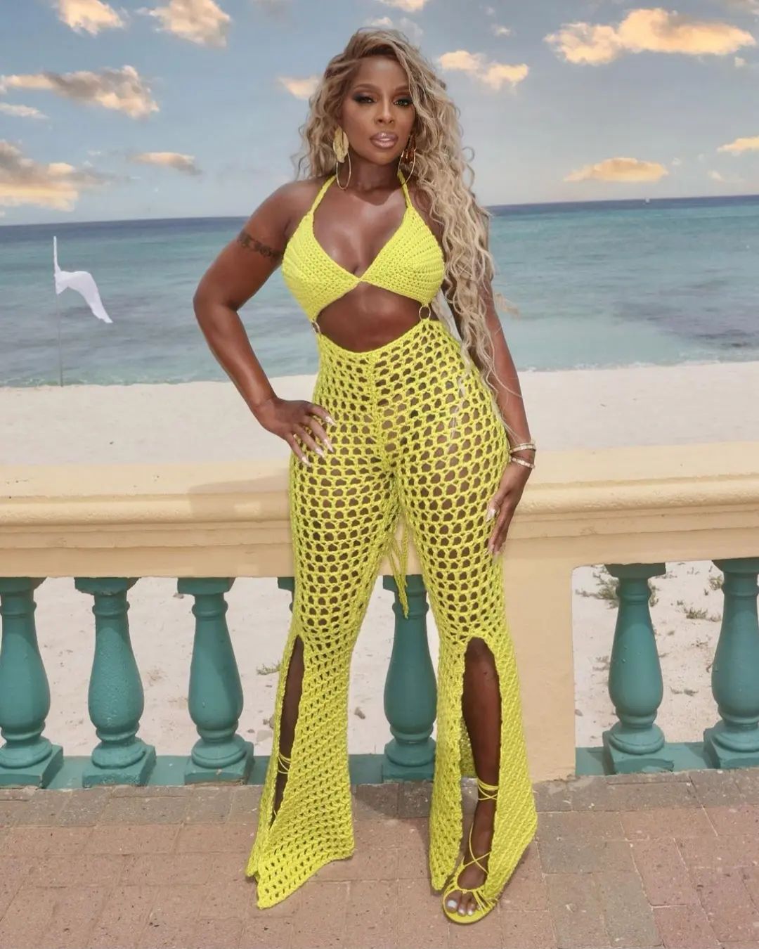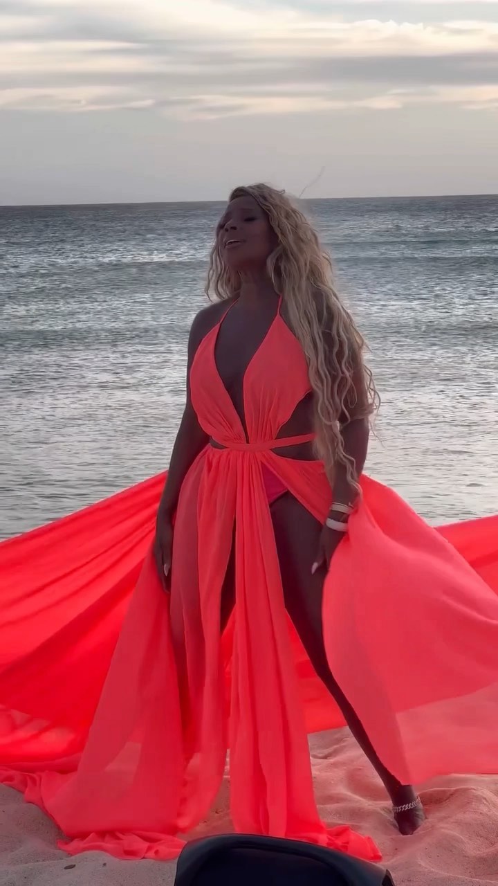 Following the tropical visuals for Mary J. Blige’s track ‘Come See About Me’, our inboxes flooded fast with requests to hunt down the ultra alluring lime green crochet jumpsuit worn by the singer-songwriter! Moments into the oceanside music video, Mary is seen getting close with her love interest and looking radiant as ever wearing the coveted look designed by Traci Couture (also carried at the BeautyLifeFun Shop). Stylist Jason Rembert added $1,250 tie-up Bottega Veneta Dot Sandals, a perfect color match.