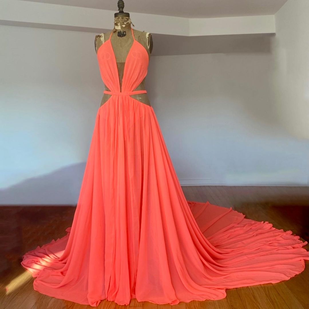 Also on the highly requested list was Mary’s coral colored dress, seen in the opening moments of the video. The high-slit, halter design was a custom Matthew Reisman Collection creation.