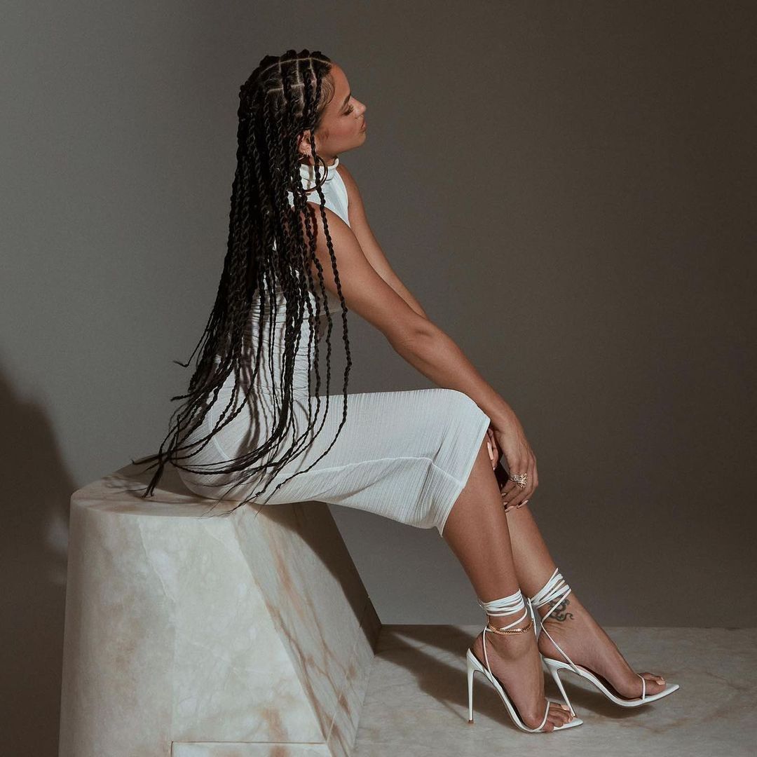 Cassie celebrated Kim Kardashian’s new SKKN launch in a photoshoot with some beautiful, textured, jumbo box braids styled by Tiger. This look can be easily DIY-ed and still look just as flawless!