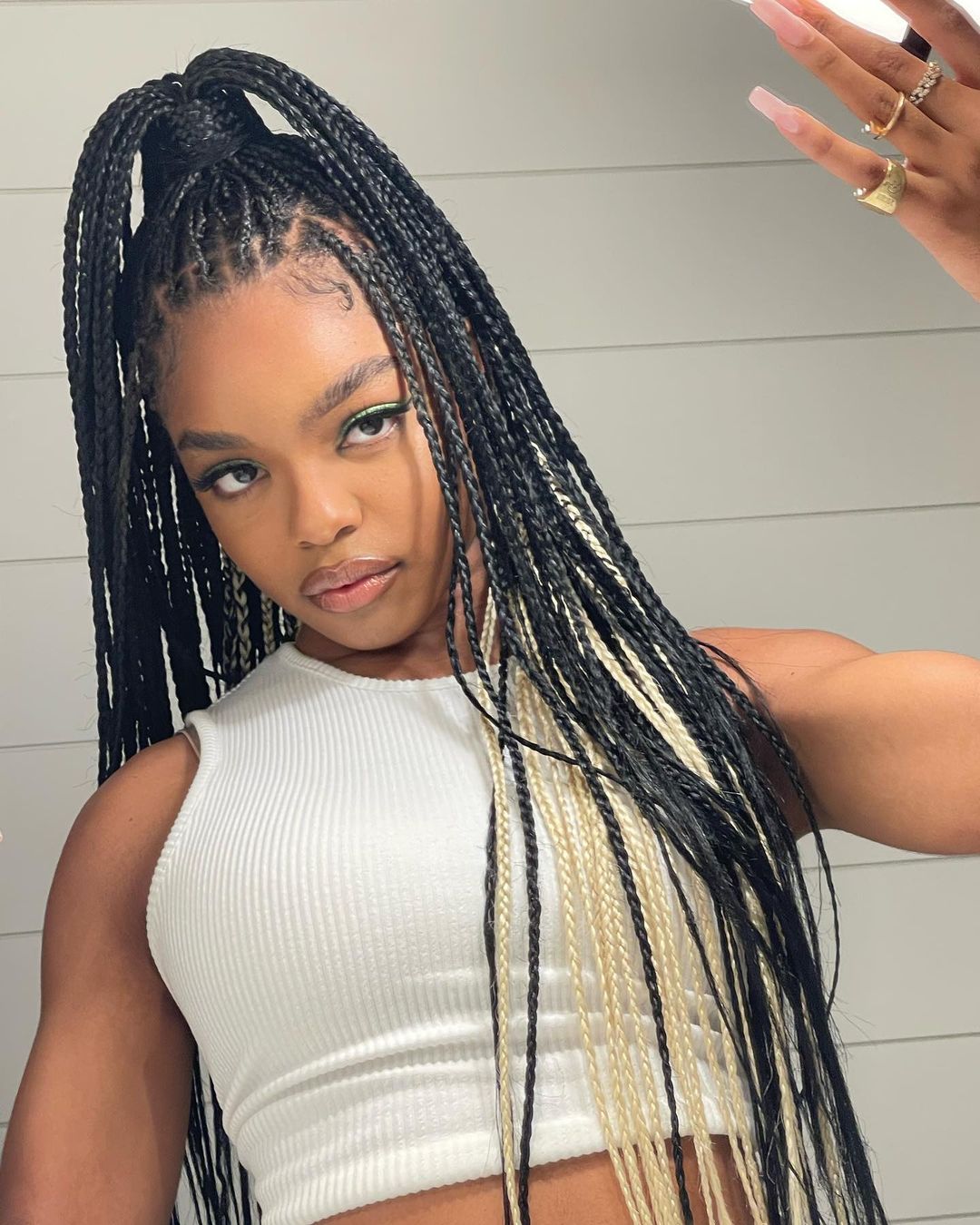 Keeping it playful, Marsai Martin took a mirror selfie showing off her new two-tone braids styled by Marie of Magnolia Hands. The style can be done with whichever pop of color you desire, so make it your own!