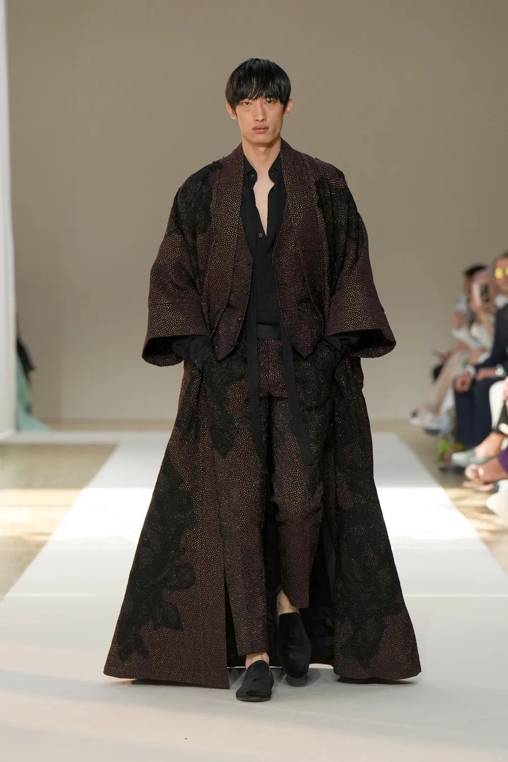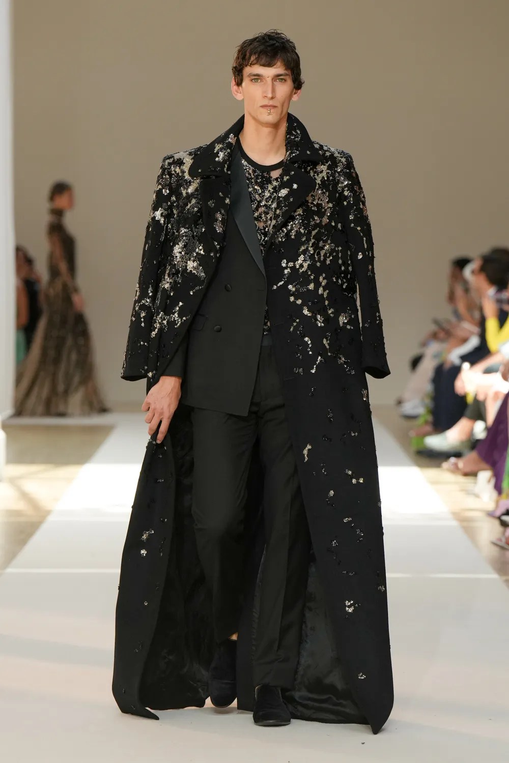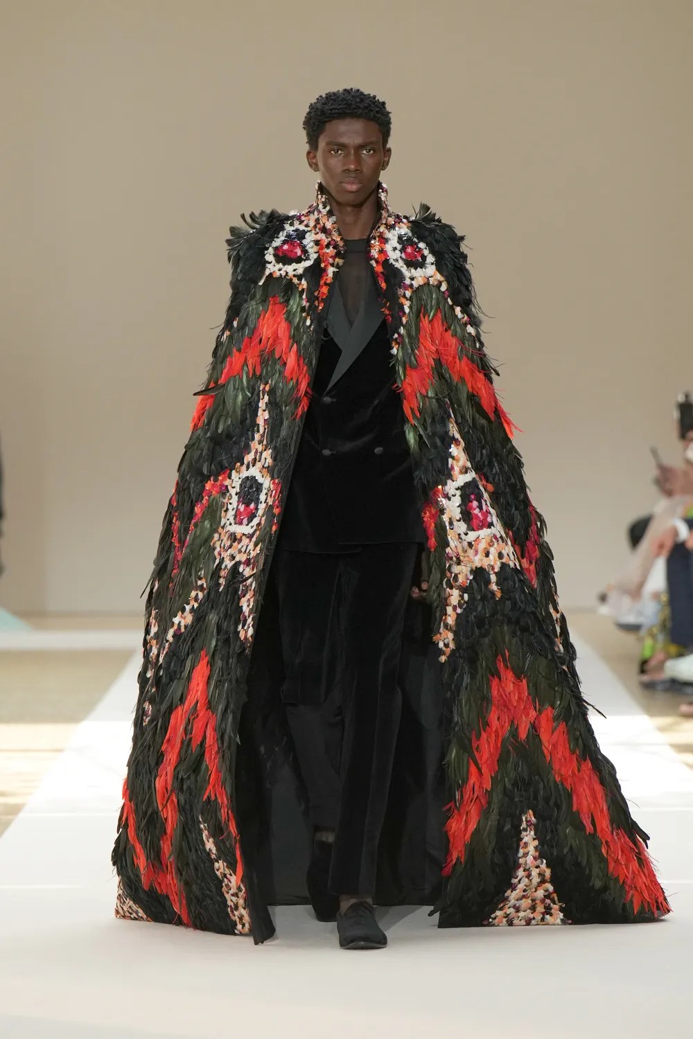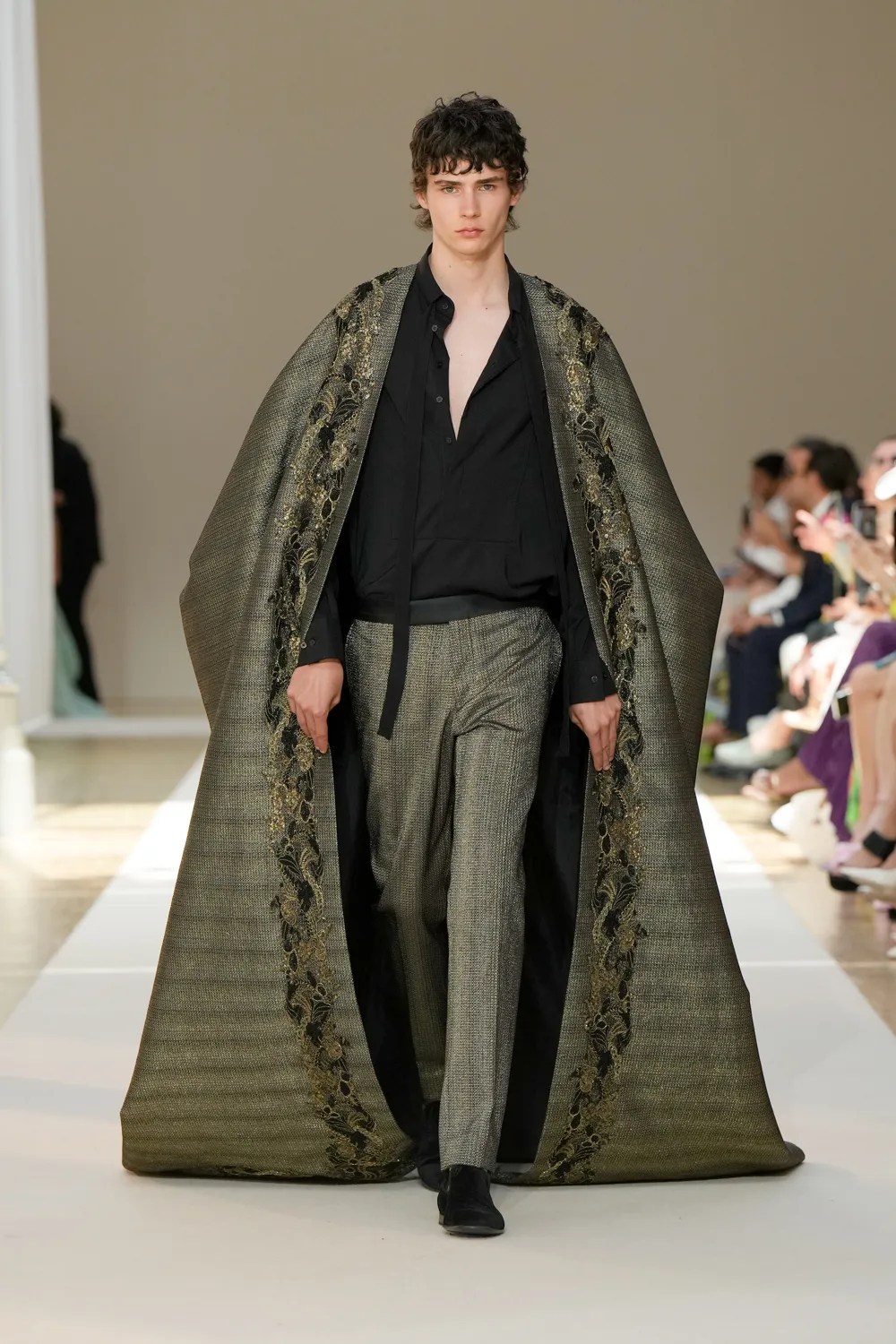 In his first foray into menswear, it seems the key is lavish layering. Tuxedos and luxury suits rest under capes and robes so exquisite you have to wonder if they would have received the André Leon Tally stamp of approval. In the post pandemic, we’re seeing a reimagining of tailoring, which Saab thoughtfully explores. Underneath the Black Tie blazers sit relaxed pussy bow dress shirts with the untied strings left hanging and Saab’s signature sheer on embroidered crewneck shirts