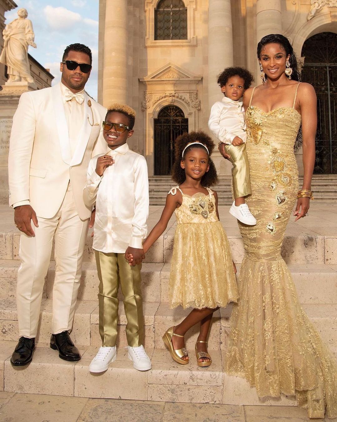 The Women’s Alta Moda show was a family function for Ciara and Russel who are longtime supports of the designer brand and brought along their three children to spectate! Styled by Kollin Carter, Ciara wore a gold lamé gown detailed with metal and embroidered hearts while Russel wore a cream colored silk tux, lapel pin, and bowtie. The kids were also dressed in D&G from head to toe.