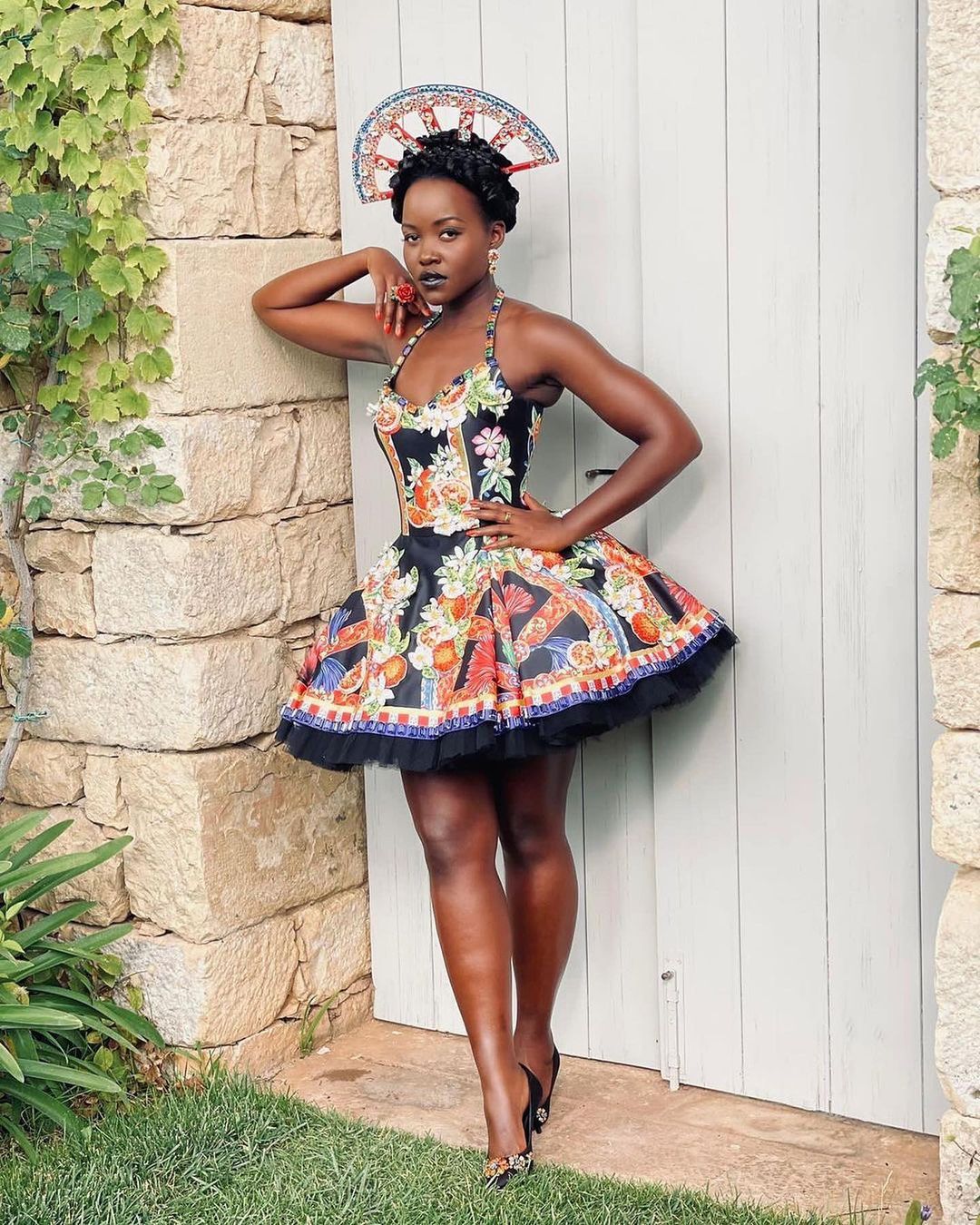 Lupita resembled a glass ballerina figurine in an awe-inspiring mini dress inspired by the Sicilian Carretto tradition for the D&D Alta Sartoria Men’s show in Marzamemi, Sicily. The dress featured embroidered floral patches, Swarovski crystals and paired nicely with a hand painted Carretto headband. Her outfit was styled by Micaela Erlanger!
