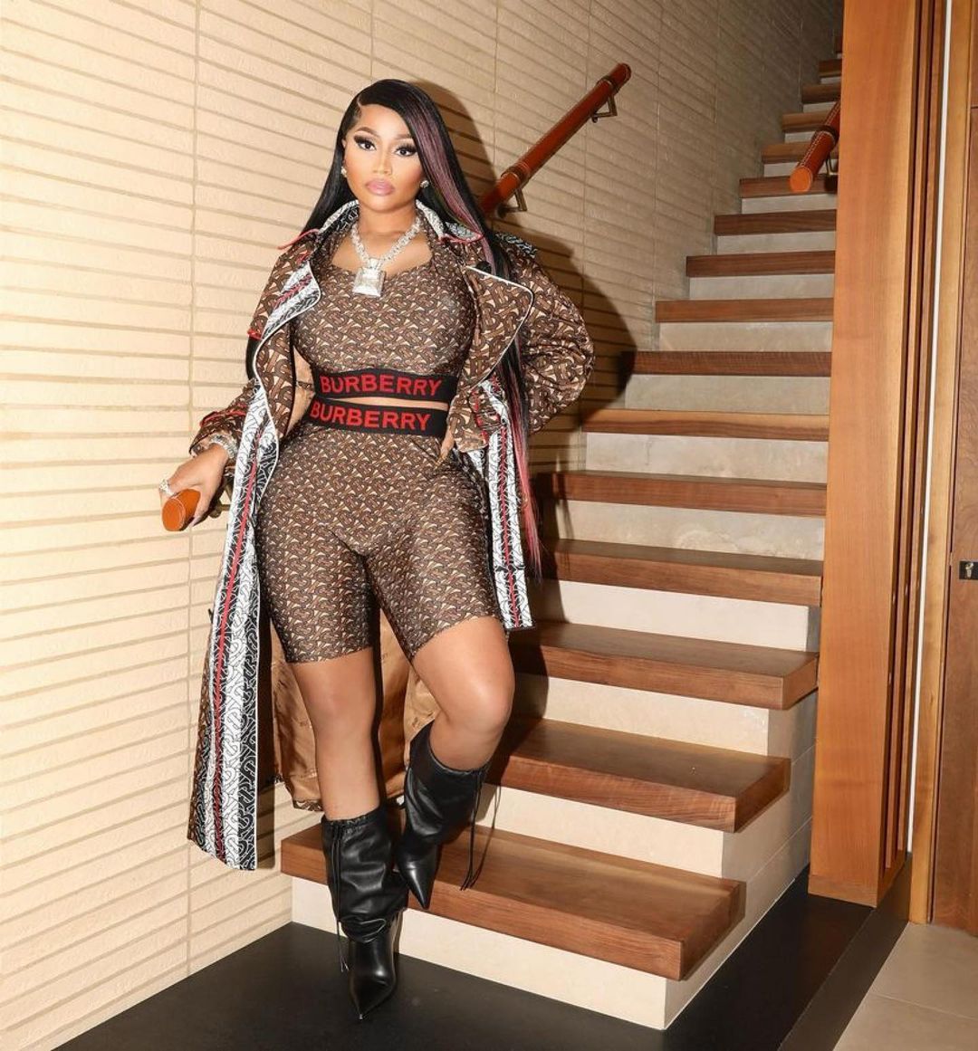 While in London, England, Nicki Minaj headlined this year’s Wireless Festival and hit the main stage in a number of ensembles, but this full Burberry monochromatic monogram moment by Riccardo Tisci took the cake! The rapper combined a $250 sports bra, biker shorts, trench coat and $580 leather drawstring boots, all of which are currently sold out.