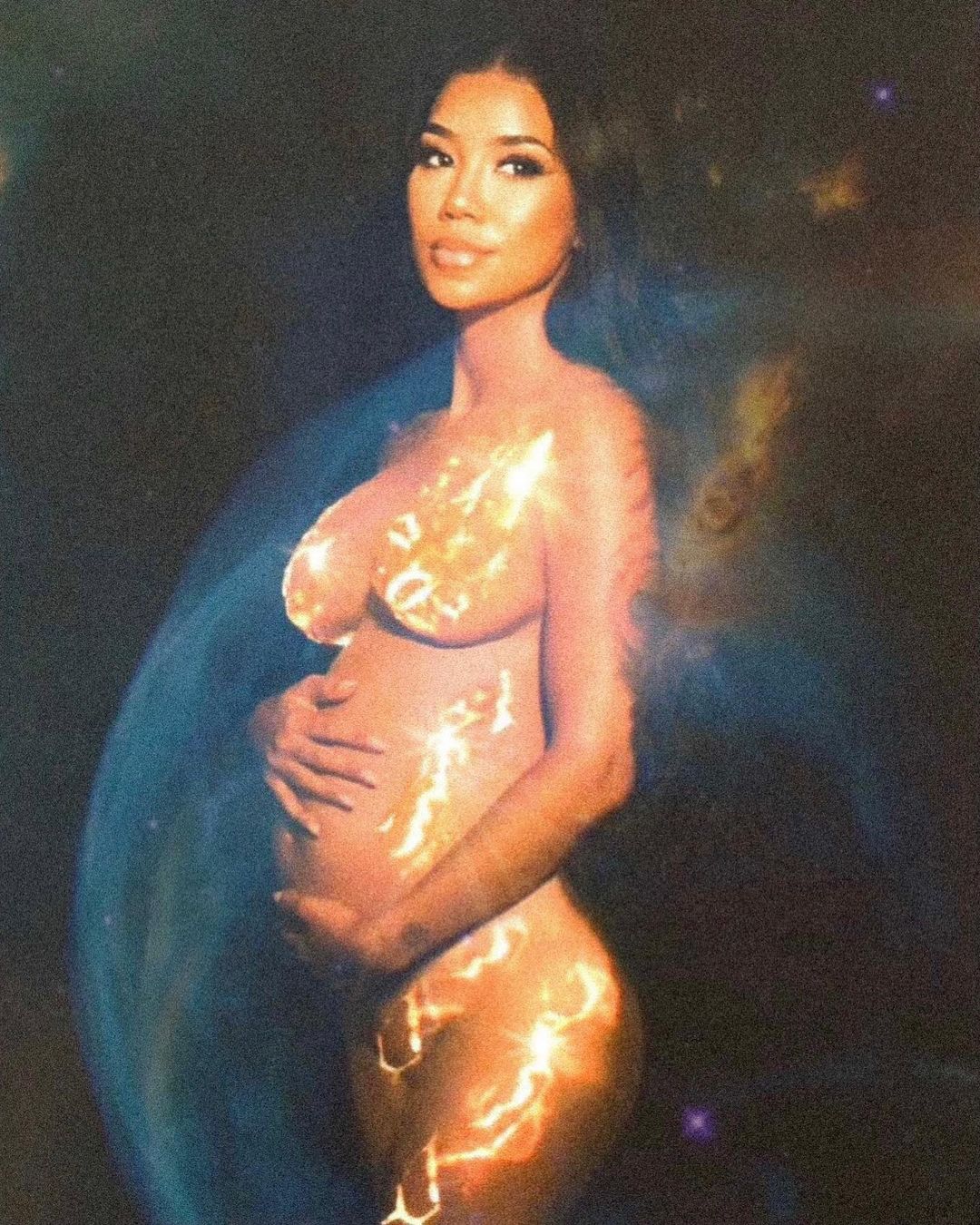 A few weeks ago, paparazzi photos of a very pregnant Jhene Aiko next to longtime partner Big Sean surfaced online, and the couple recently confirmed what we already knew by posting a breathtaking photoshoot to their respective Instagram accounts! Photographed by Renee Rodriguez, the two are posed side by side and skin to skin, Jhene covered in galaxy nebulas all over her body.