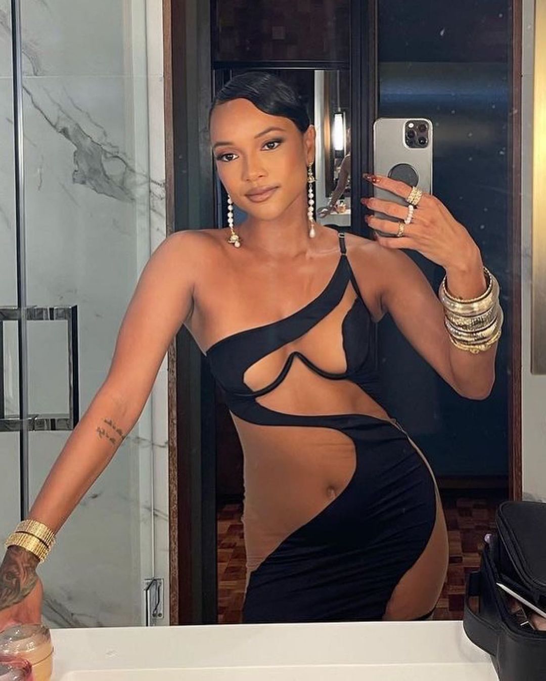 Karrueche snapped some mirror pics before heading out in LA wearing a $209 GSQ dress styled by Alexus Shefts! All cut-out pieces are made with illusion mesh in different shades to best match your complexion.