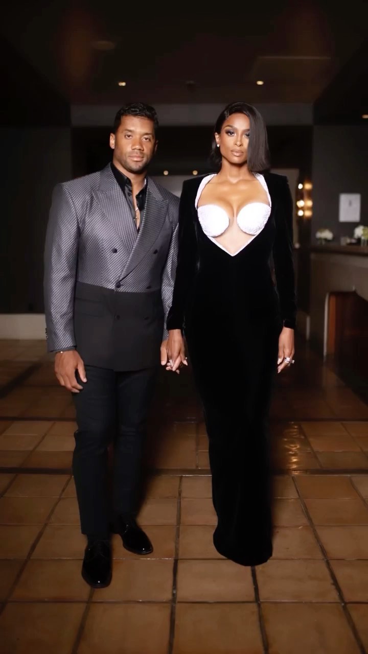 Last but not least, Ciara and Russel arrived to the scene together. While Russel’s suit was a Dolce and Gabbana number, Cici wore a black velvet long sleeve gown with a white trim at the deep v-neck and white cups. Her outfit was styled by Kollin Carter.