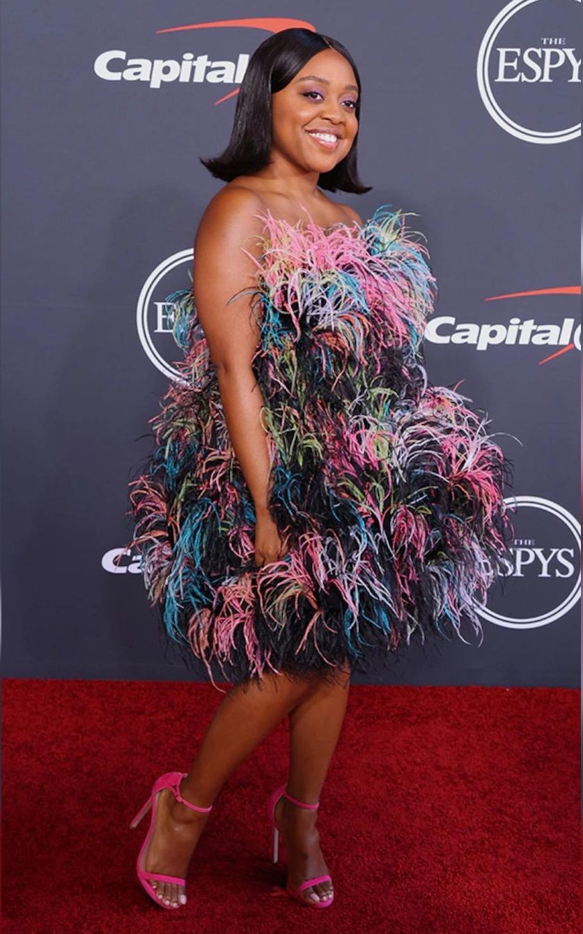 Quinta Brunson was looking sharp in a feathery multi-colored Prabal Gurung SS22 dress to the 2022 ESPYs, styled by Bryon Javar! What’s not to love?