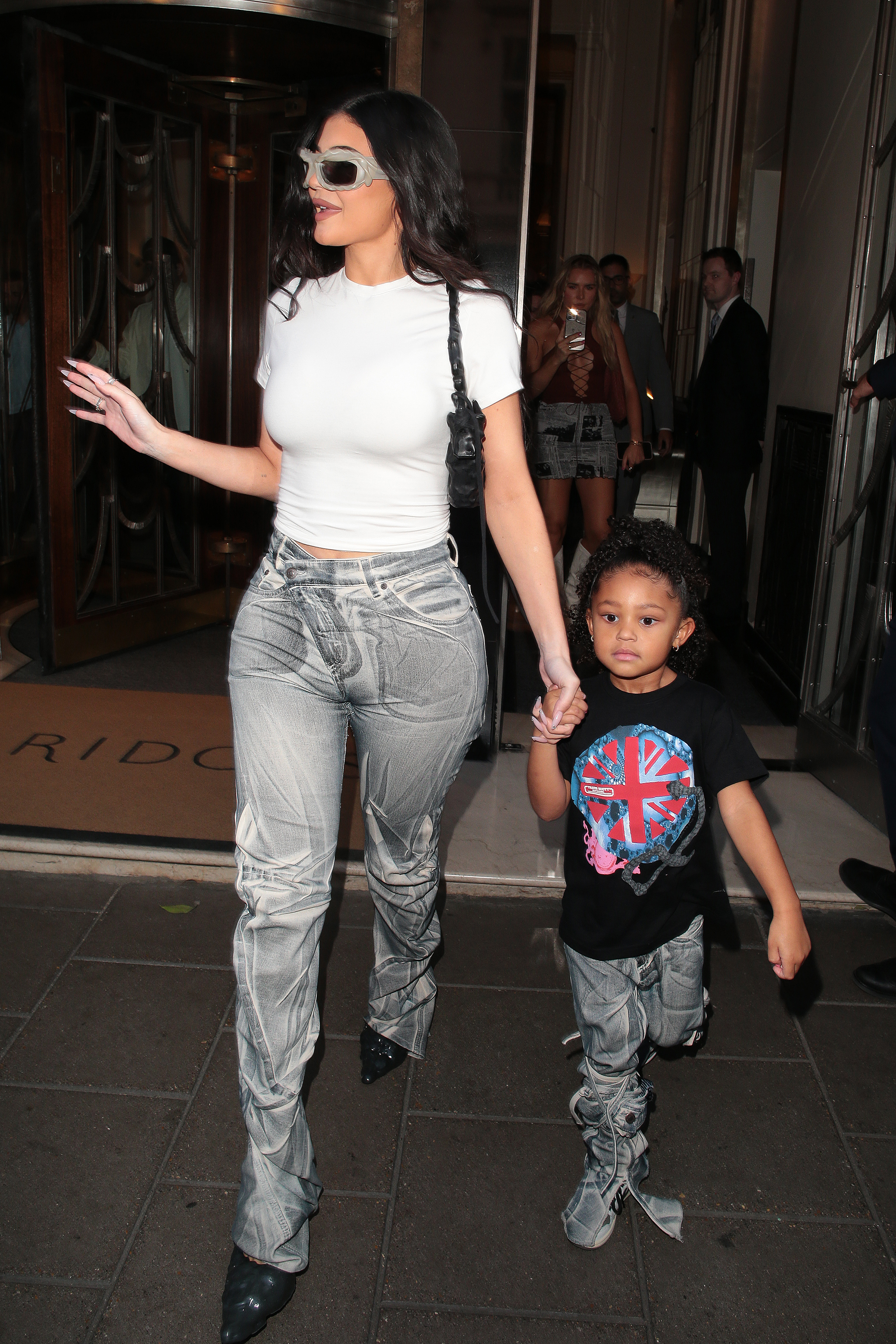 LONDON, ENGLAND – AUGUST 06: Kylie Jenner and Stormi seen leaving their hotel in London, on their way to the O2 to see Travis Scott’s gig on August 06, 2022 in London, England. (Photo by Ricky Vigil M/GC Images)