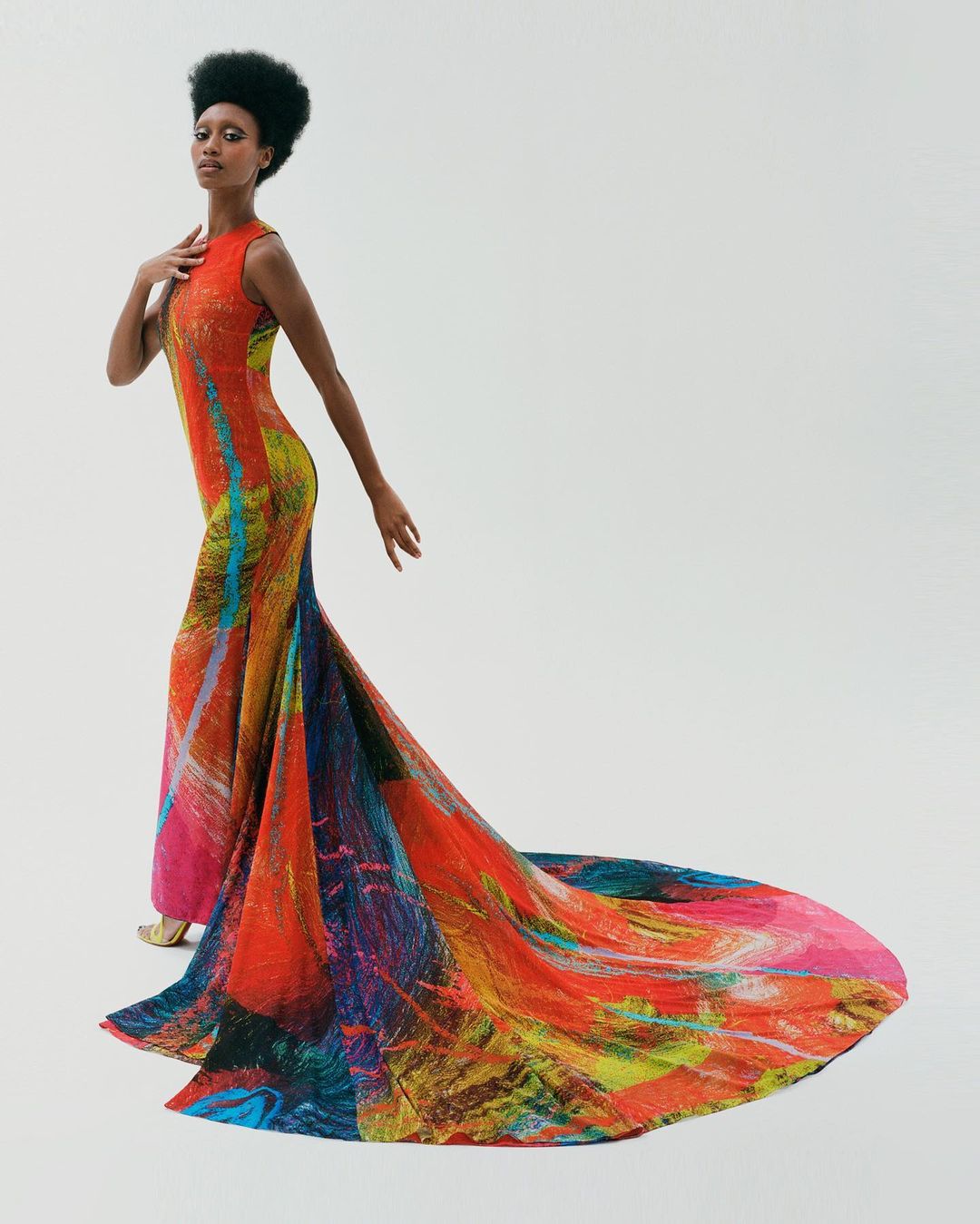 Get the look: $3,495 Christopher John Rogers Christopher John Rogers Abstract Crayon Racerback Godet Evening Gown with Train