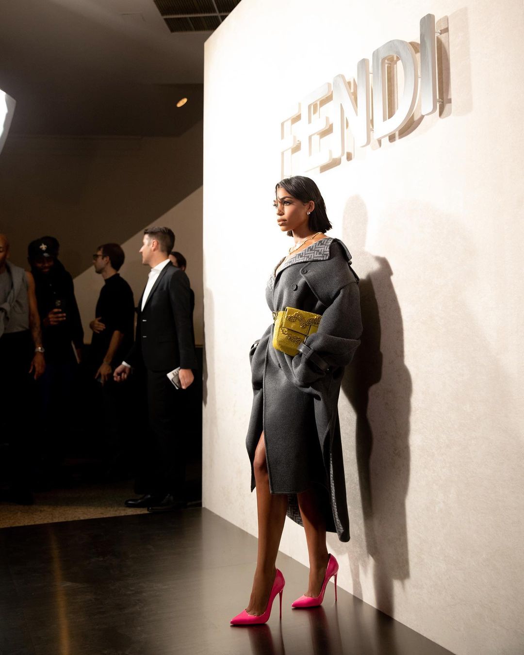 Entering the Fendi fashion show, Lori was dressed accordingly in full Fendi. Her stylist Elly Karamoh put her in a grey wool trench with pink stilettos and a yellow handbag.