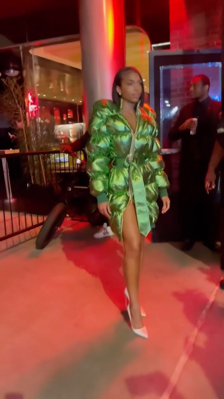 Elly played up the coat dress theme in another Christian Cowan look featuring a green metallic puffer with a slit. It looks like pointy stilettos are the shoe of choice for these two seeing this ‘fit was also paired with white ones!
