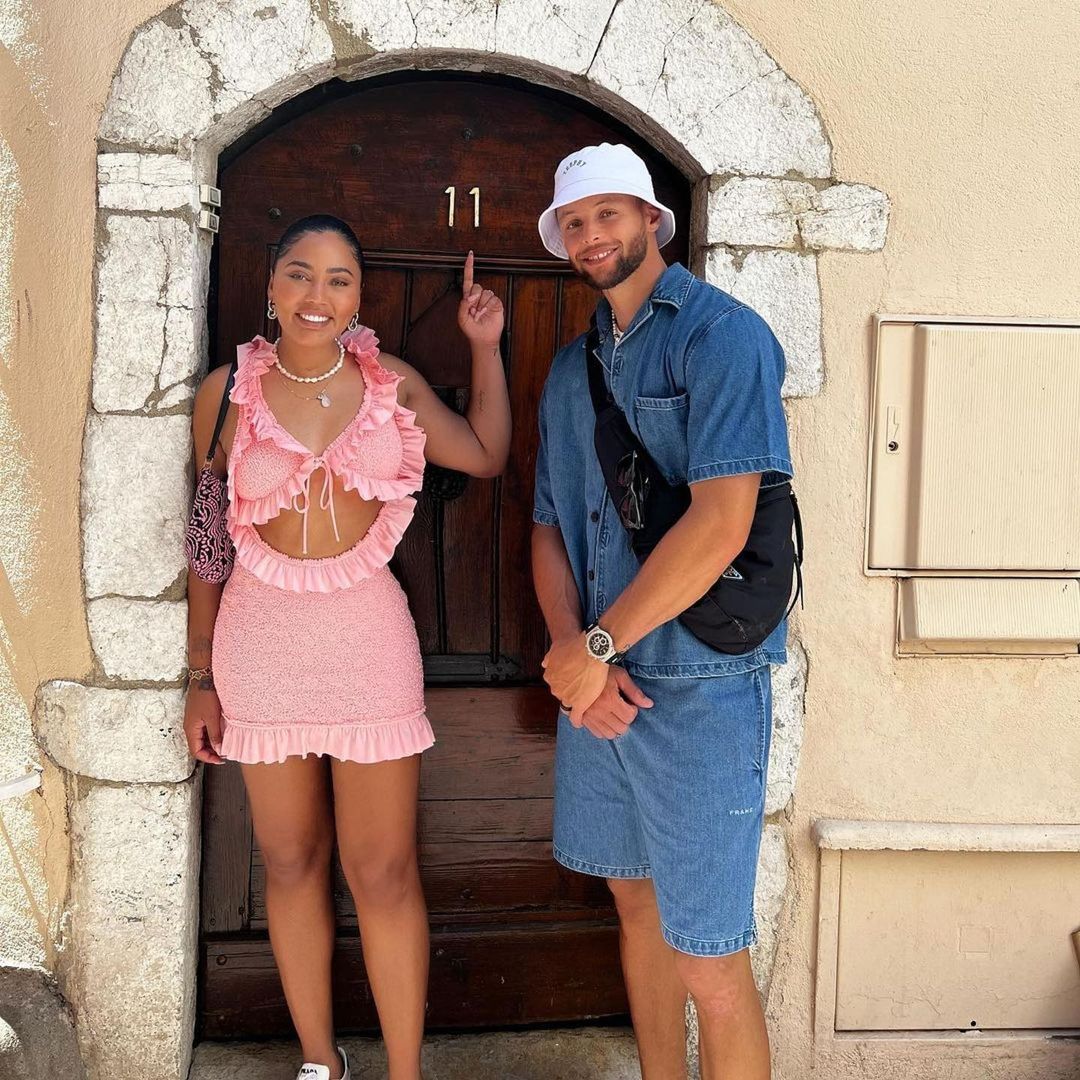 Since then, Ayesha Curry was also spotted in the same cutout, smocked mini at the end of July with Stephan Curry as they celebrated their 11th wedding anniversary in the South of France! Ayesha paired the look with a black and pink embroidered Prada bag while her husband Steph carried a Prada bag of his own and wore denim Frame outfit.