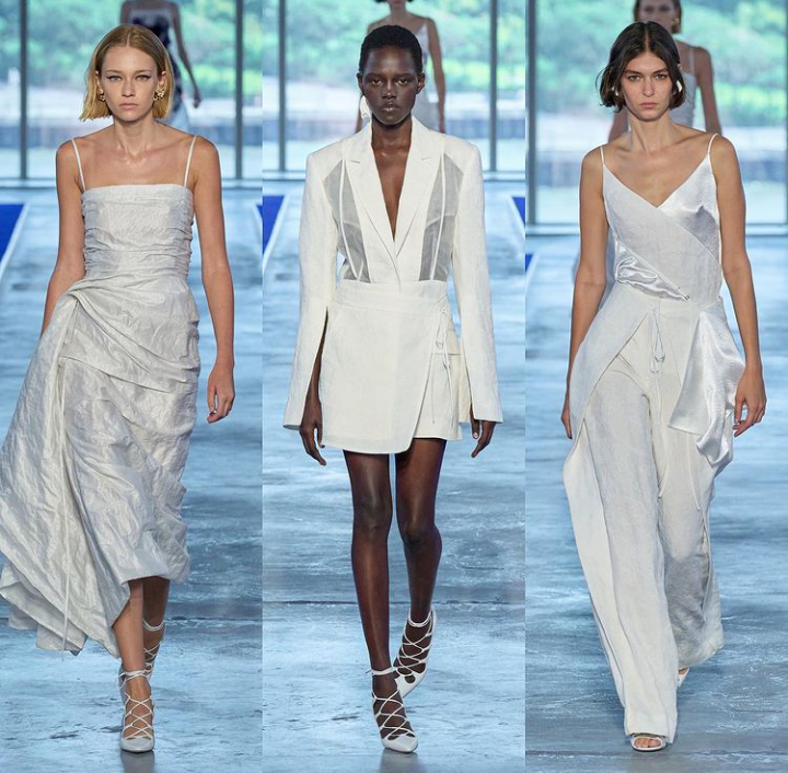 Adhering to a subdued color palette of white, black, ivory, and light purple, Wu offered alluring blazer dresses, breezy jumpsuits and layered cocktail dresses that offer new silhouettes that still manage to skew classic and ageless.
