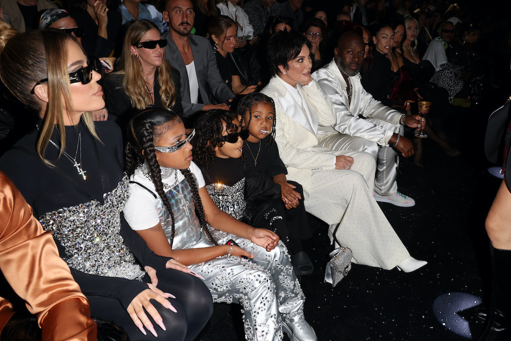 I write, “Dolce & Gabanna always upholds the values of family–it’s a consistent theme for all of their runway shows, which frequently feature celebrities and their kin. Fittingly, Kim’s family sat front row to cheer her on for her big moment. Khloe Kardashian, Kris Jenner, and Corey Gamble were in attendance, as were her children with Kanye West: Saint, North, and Chicago. The whole family glittered and shined in sparkling accessories, almost angelic white ensembles, and jewelry, with the kiddies innocently sucking on lollipops (as children do).”