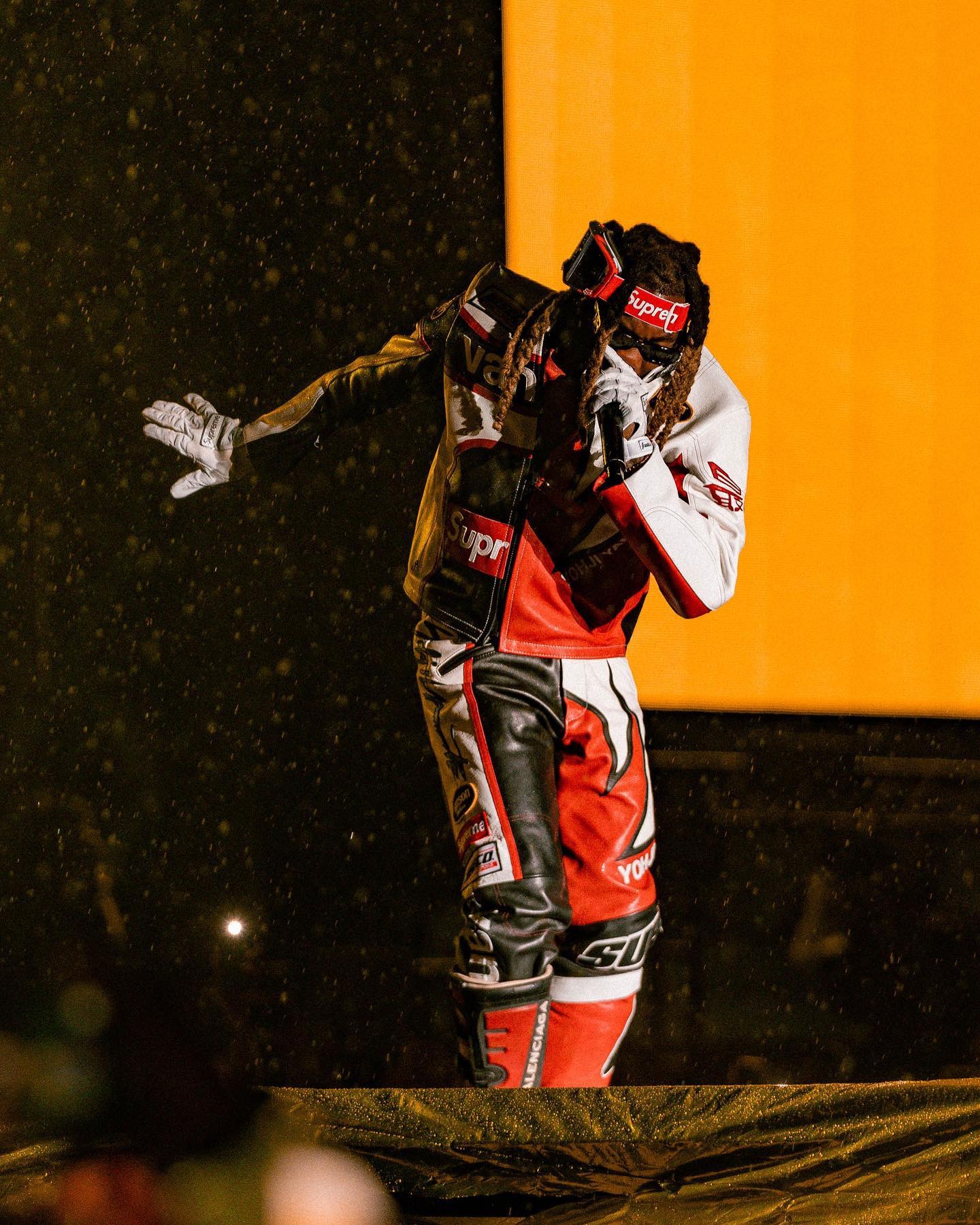 Offset came out as a surprise guest clad in the Supreme x Yohji Yamamoto x Vanson Leathers split jacket and pants. He kept the Supreme theme going by wearing the VUE goggles made in collaboration with Fox Racing and the Franklin Sports x Supreme pro batting gloves. On his feet were the Balenciaga motocross boots, which came in handy when it started raining.