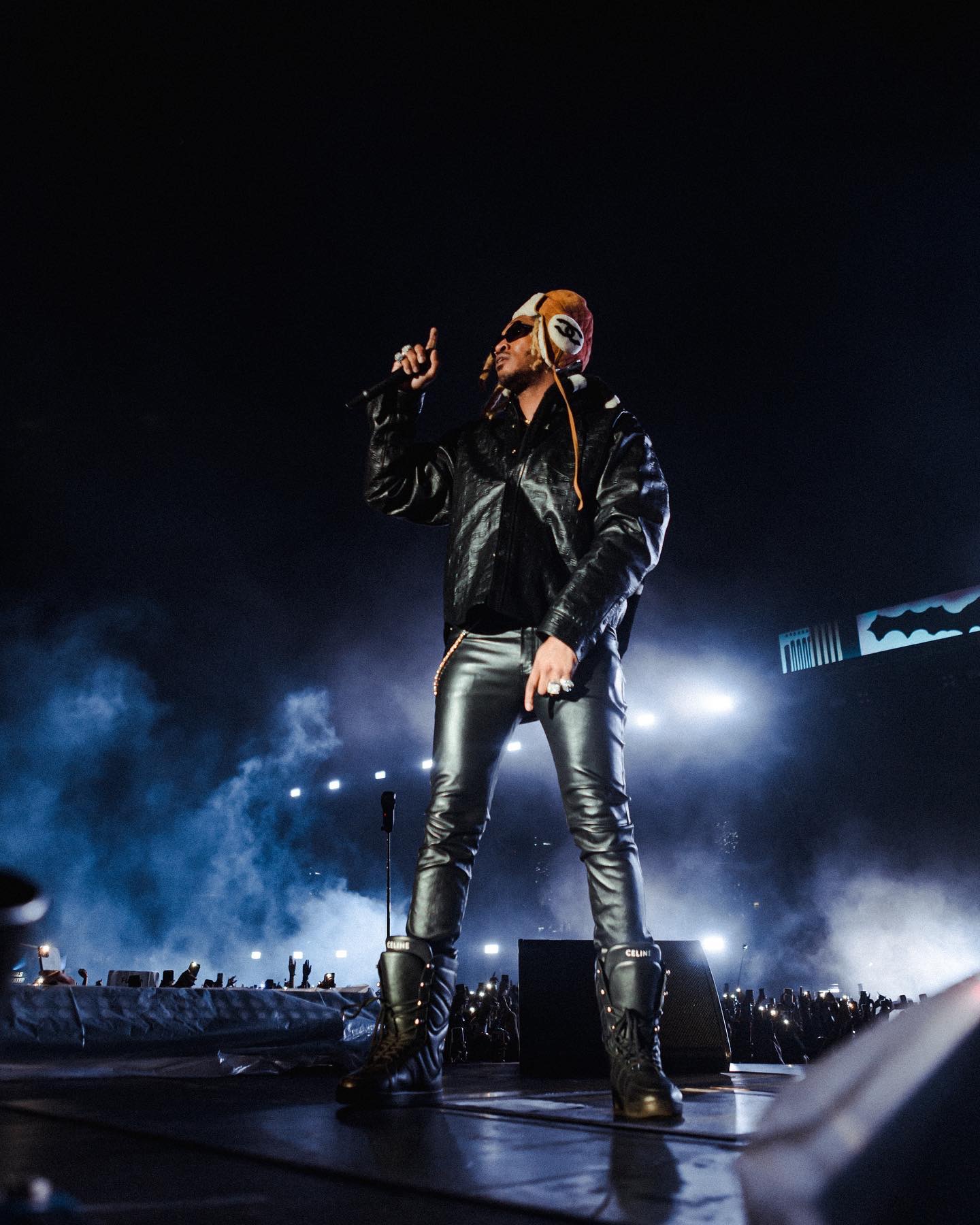 Closing out Rolling Loud NY with a…let’s say splash, Future invited Offset onto the stage to deliver a final fair well to the epic three-day festival. The show started on peak intensity with Future, dressed in a leather look by Balenciaga and Celine, finished with a Chanel shearling trapper hat–– started his set with a hype performance of Pushin’ P and other hits.