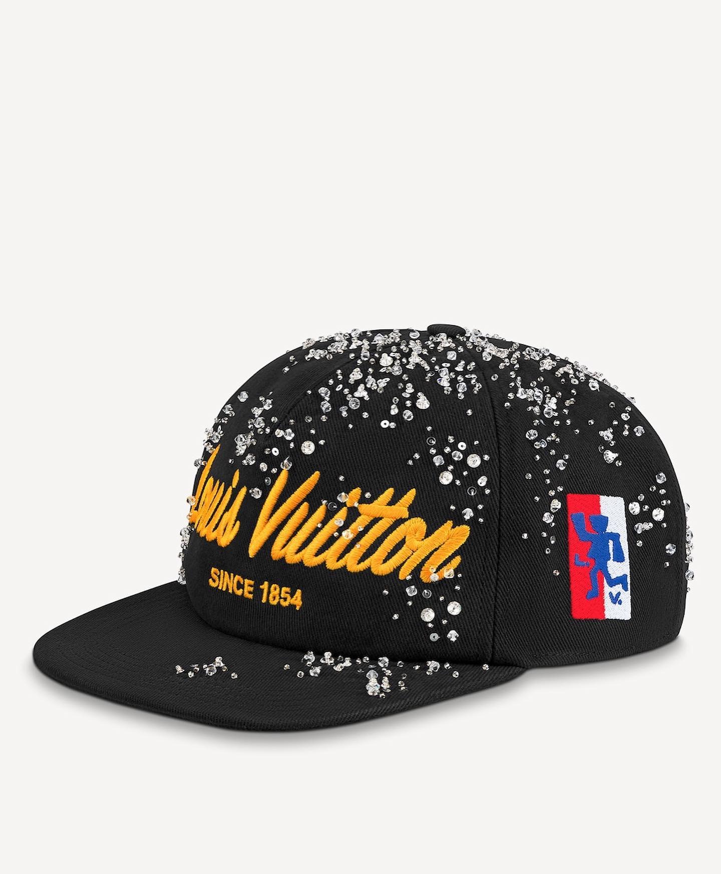 Outfitted with a yellow embroidered Malletier script, the LV Blue Man patch, and a plethora of crystals, this fanciful cap paired perfectly with Gunn’s flooded Cuban link chains.