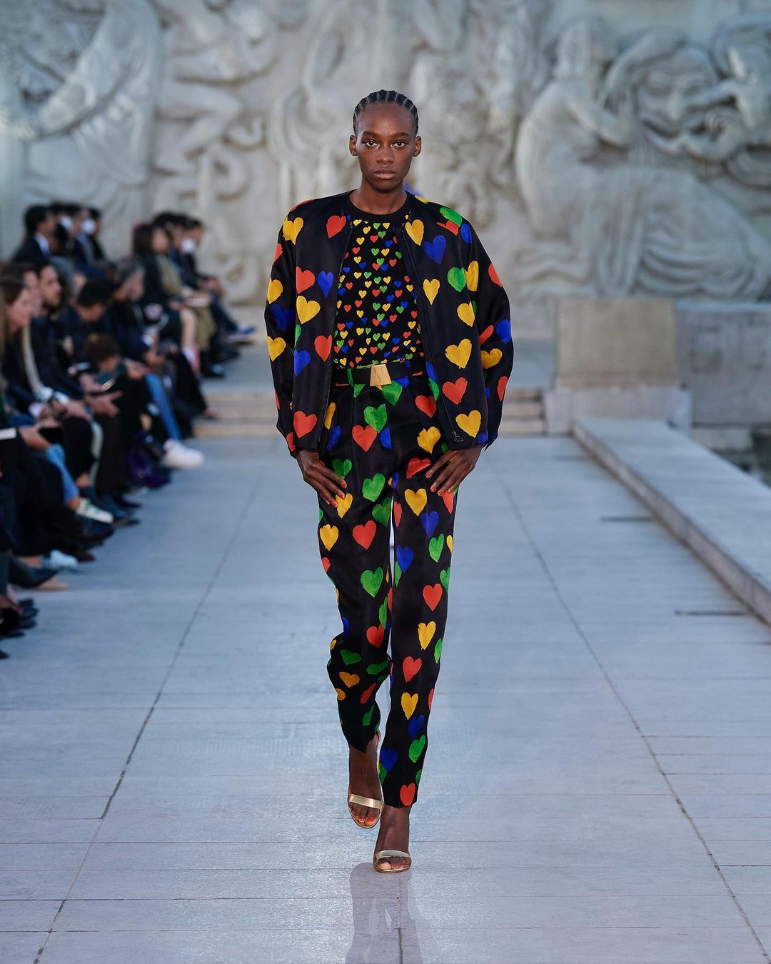 On the runway, a black ensemble patterned with hearts in all the colors of the rainbow brought so much life to the presentation! The hearts were a throw back to a print introduced by the designer label during the 80s!