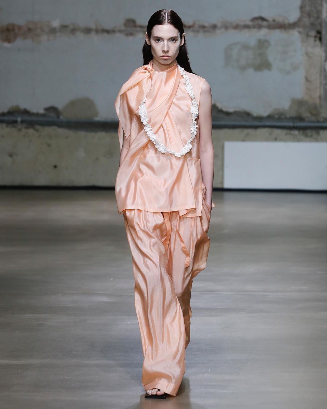 It wouldn’t be a Christian Wijnants show without some edge, which is why we’re very into this latex accessories – including this latex sock moment above – that instantly elevate every look, keeping the materials light and eccentric! Models wore dewy natural makeup with a sandlike addition to the side of the face, evoking the beach vibes.