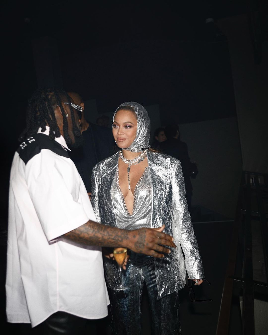 Later on, ‘Yoncé revealed a second change of outfit also styled by KJ, a monochromatic silver look with a Paco Rabanne headpiece and top, a Comme Des Garcons jacket, Gucci pants, Jimmy Choo shoes and Loewe glasses.