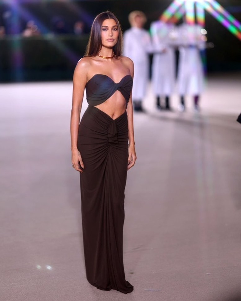 Styled by Karla Welch, Mrs. Bieber made matching your hair color to your dress a thing in this chocolate colored Saint Laurent cutout design.