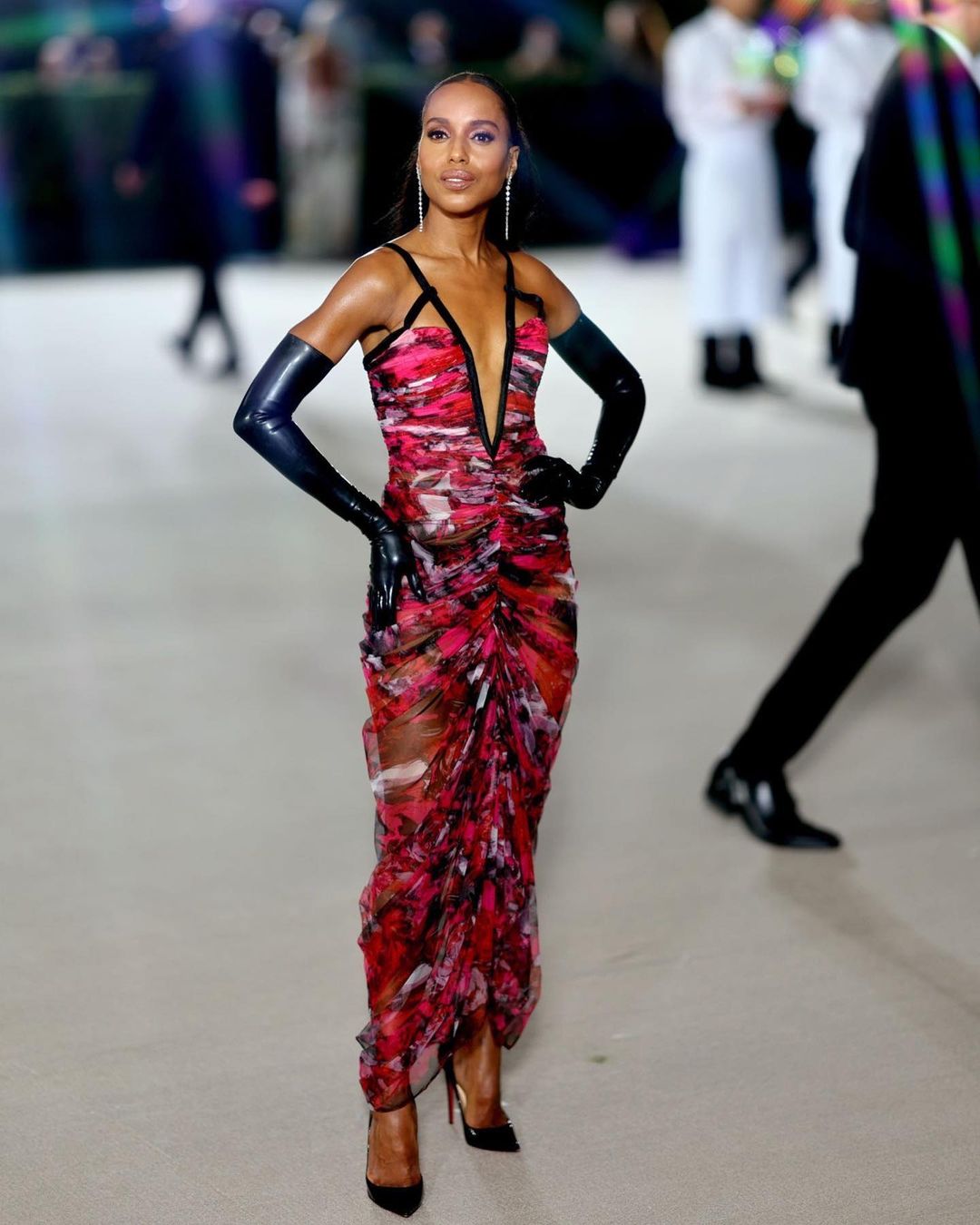 Also styled by Law Roach was Kerry Washington! Her sheer deep V dress and latex gloves were by Prabal Gurung.