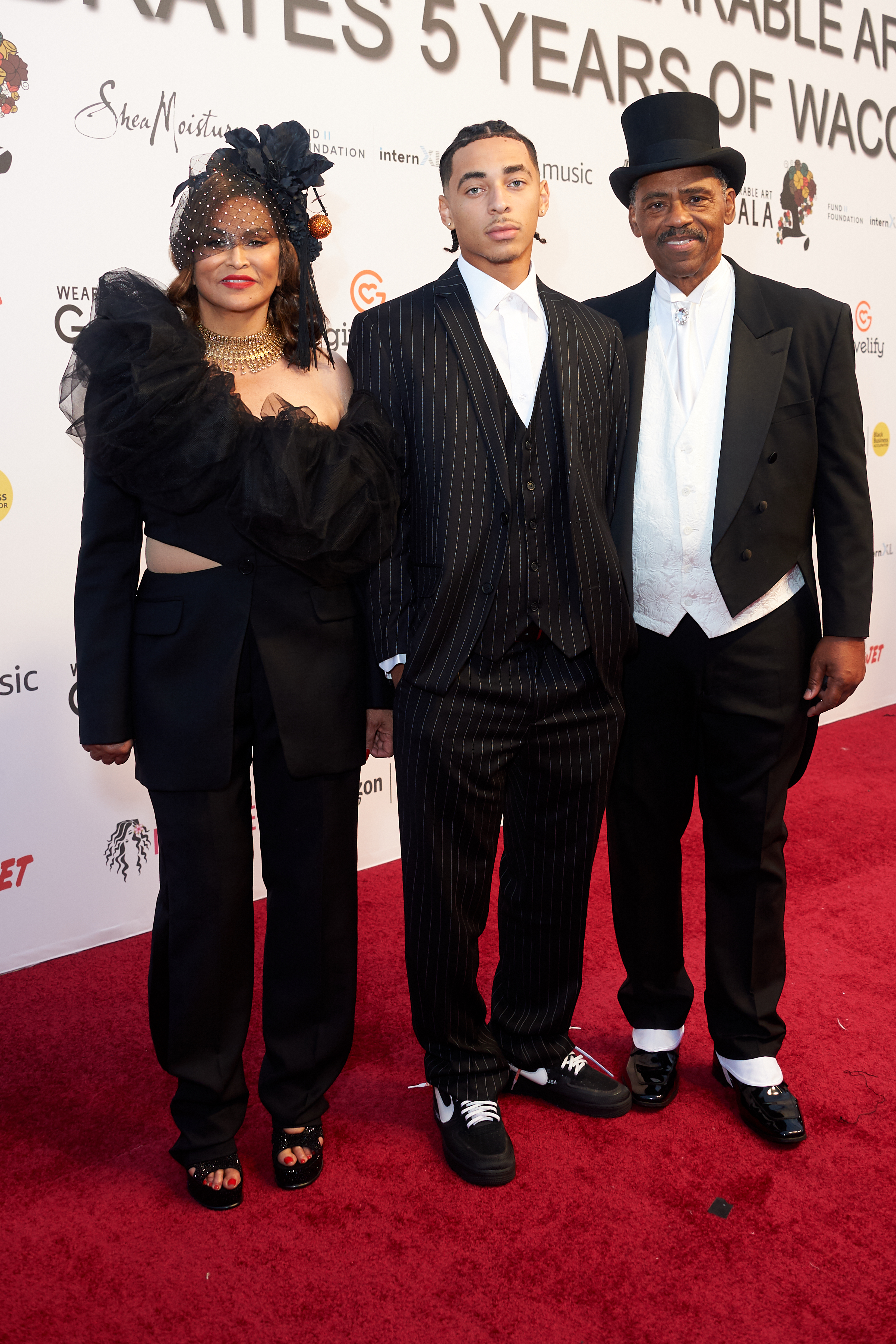 SANTA MONICA, CALIFORNIA – OCTOBER 22: (L_R) Tina Knowles Lawson, her grandson and Richard Lawson attend the 5th annual Wearable Art Gala honoring Angela Bassett and Mark Bradford at Barker Hangar on October 22, 2022 in Santa Monica, California. (Photo by Unique Nicole/Getty Images)