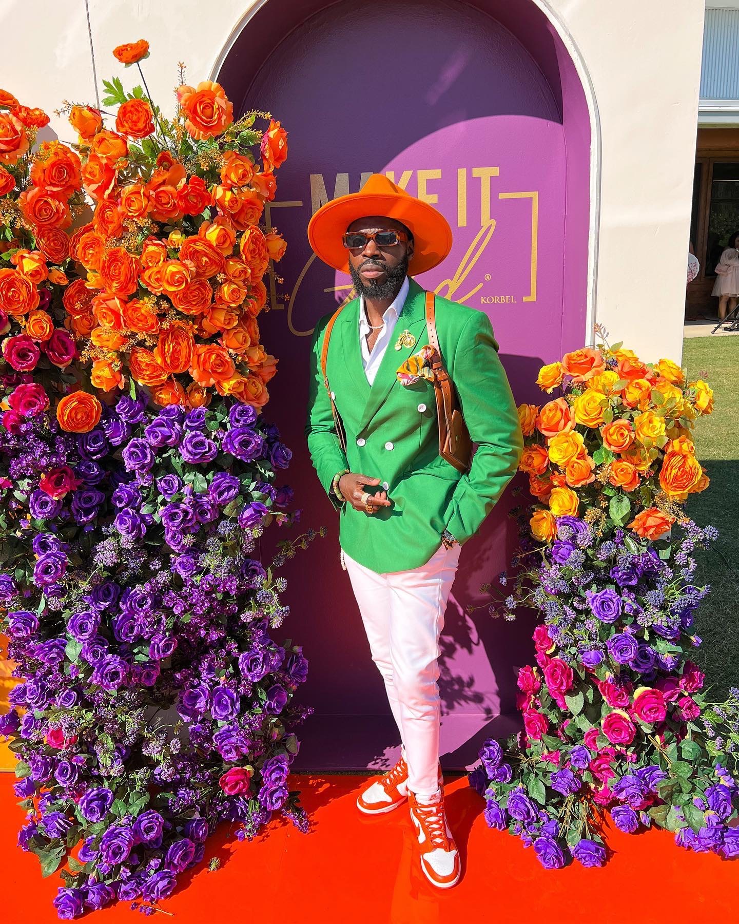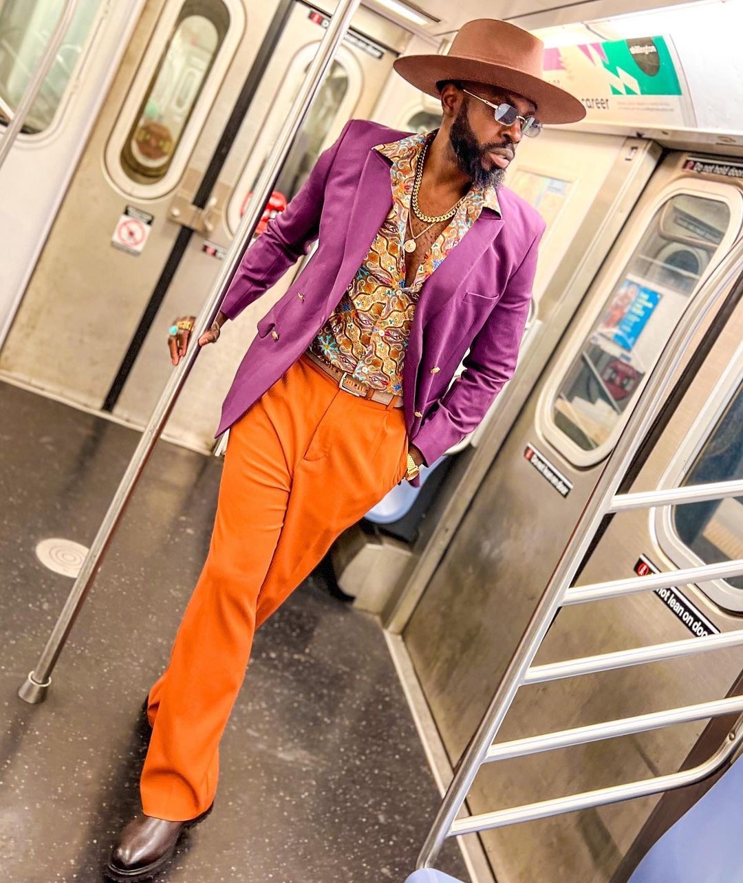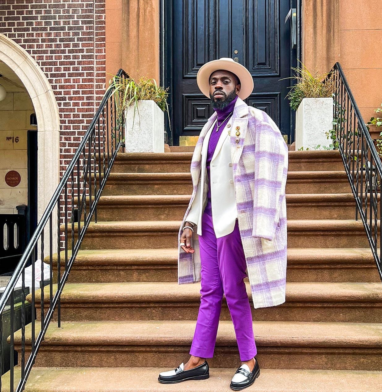 Radley’s wardrobe is filled with sleek suits and color so saturated you’d think he invented dopamine dressing. Though he tends to embrace all bright and bold hues, one look at his IG page will tell you that he may favor purples, oranges, and reds above all other colors. You’ll rarely see this fashion figure without a hat. While wide-brim fedoras are his go-to, Radley does dabble in baseball cap territory for his sportier looks.