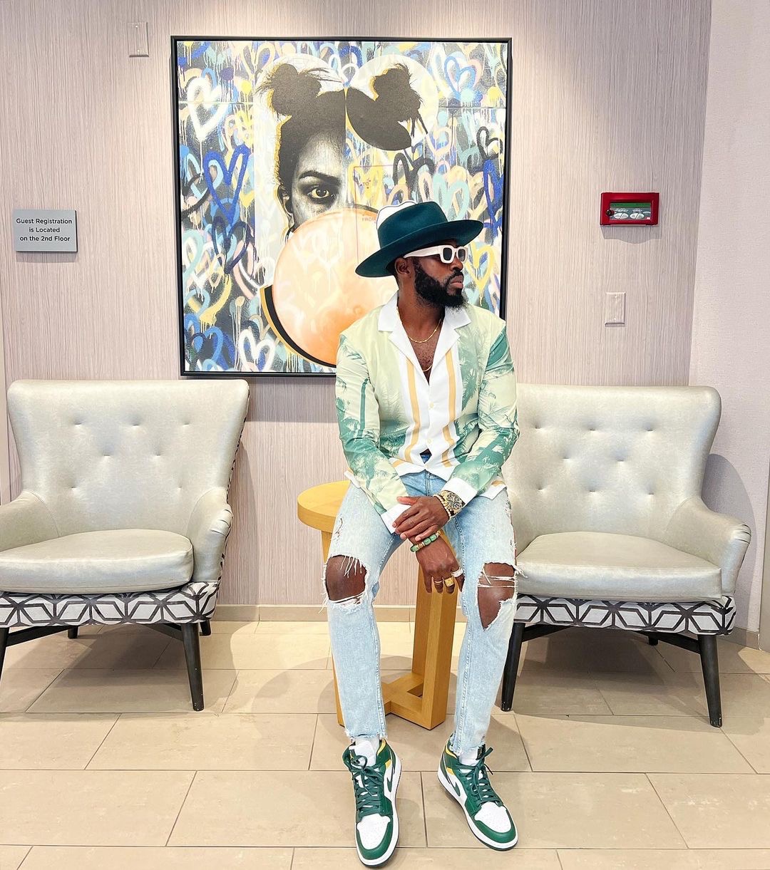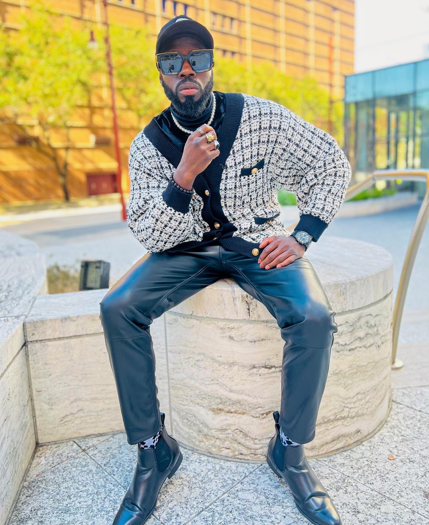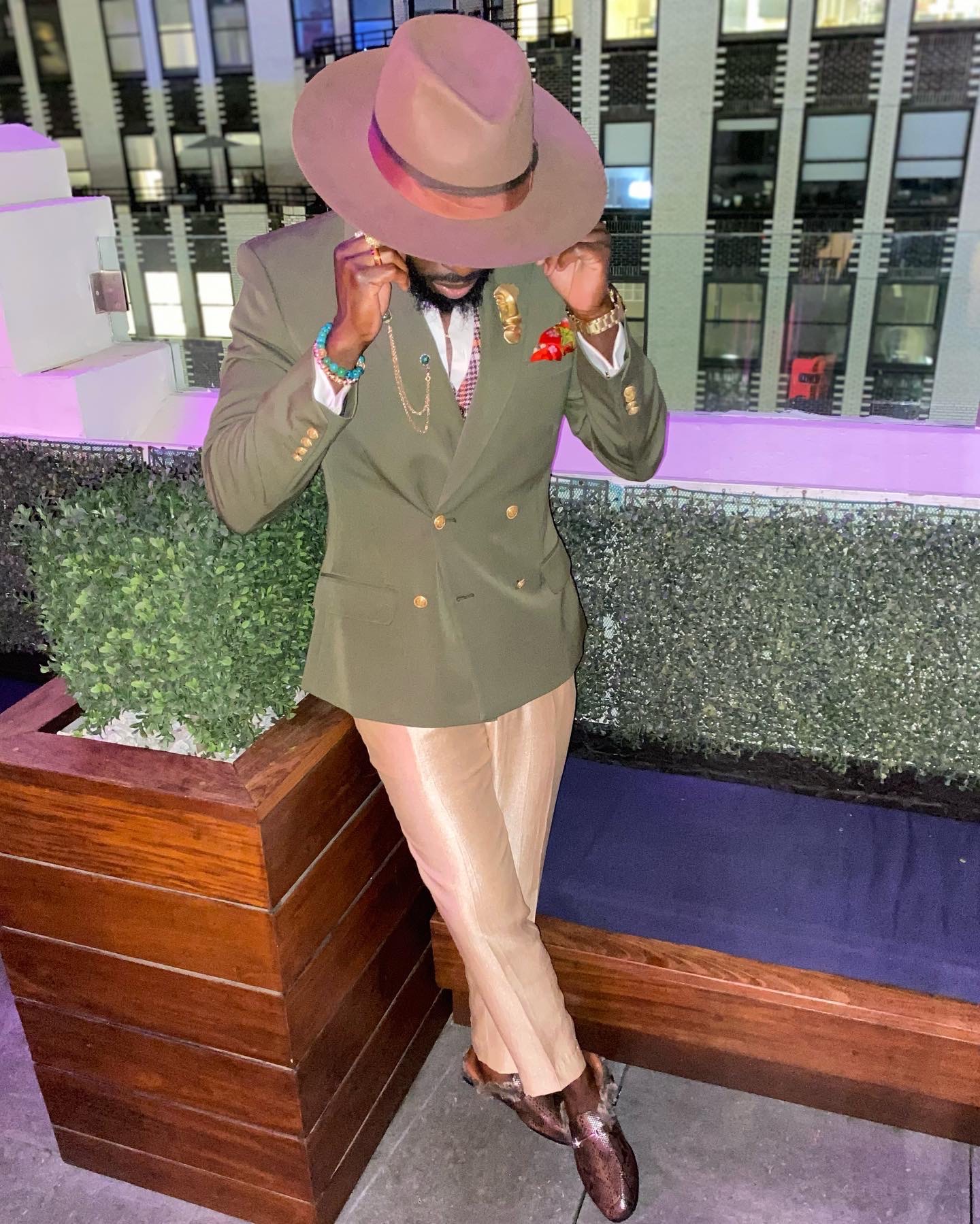 Radley’s wardrobe is filled with sleek suits and color so saturated you’d think he invented dopamine dressing. Though he tends to embrace all bright and bold hues, one look at his IG page will tell you that he may favor purples, oranges, and reds above all other colors. You’ll rarely see this fashion figure without a hat. While wide-brim fedoras are his go-to, Radley does dabble in baseball cap territory for his sportier looks.